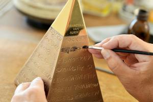 Die Namen der Preisträger sind seit jeher prominent ganz oben an der vergoldeten Spitze platziert. Das Datum und der Ort der feierlichen Überreichung stehen am Fuß des 20x12x12 Zentimeter großen Preises. Der Korpus und die Platte der im Schleuderguss-Verfahren hergestellten Pyramide sind einzeln zusammengeschweißt. Der hohlmontierte Bronzeguss ist 2,3 Kilogramm schwer, die Spitze ist mit einer galvanischen Vergoldung veredelt.