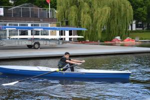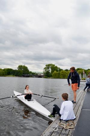 Auch Carla hat Erfahrung, im Kanufahren. „Das ist aber ganz anders. Rudern ist viel anstrengender als Kanufahren“, so die Elfjährige. Bei den Jungen ist die Stimmung ähnlich ambivalent: Milan findet Rudern „echt cool“ und will unbedingt in den Kurs. „Es ist witzig, zu sehen, wie unregelmäßig wir rudern im Vergleich zu den Kennern, die absolut synchron unterwegs sind“, sagt er bewundernd. Sein Freund Valentin ist aufgeregt: Gleich muss er aufs Boot. „Das ist ganz schön wackelig“, findet er. „Deshalb lernen die Kinder auch erstmal mit Skulls, also einem Ruder in jeder Hand“, erklärt Trainer Ben Böttcher. Später geht’s dann an die Riemen, die mit beiden Händen gehalten werden.