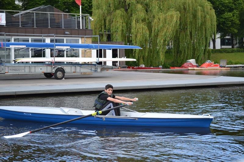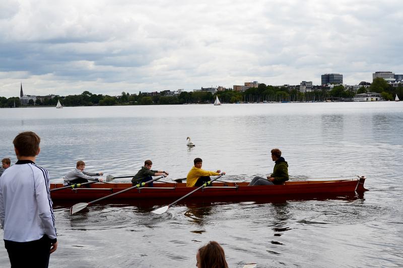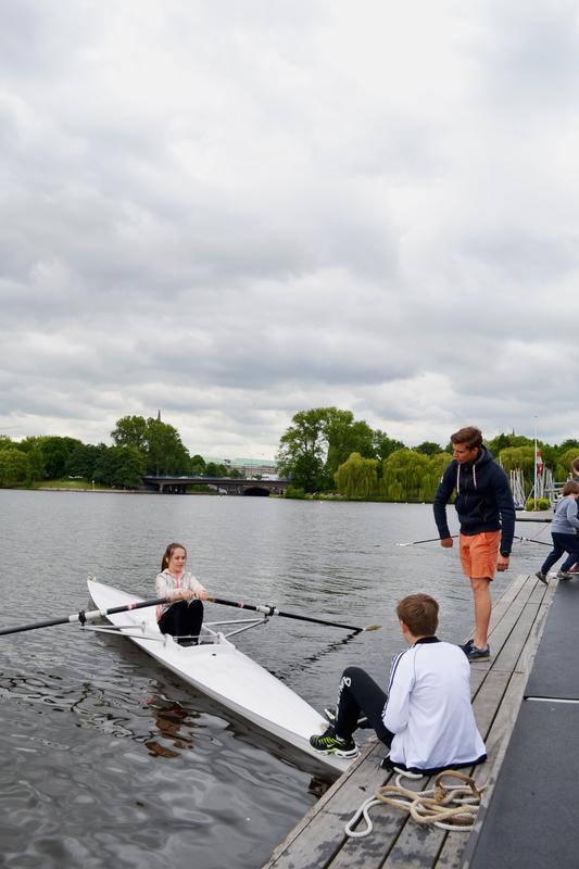 Das Rudertraining findet ganzjährig statt, von April bis September im Wasser, im Winter in der Turnhalle oder im Ergoraum. An einem warmen Frühsommertag veranstaltet die Schule einen Schnuppertag. Rund 25 Fünftklässler tummeln sich am Bootssteg und lauschen den Anweisungen der älteren Schüler. „Neben Sportlehrern und Trainern des Germania Ruder Clubs kümmern sich erfahrene Ruderer aus der Schülerschaft um die Anfänger“, erklärt Nils von Arnim. Dazu gehört Ben Böttcher, der gerade sein Abitur macht.
