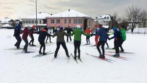 Doch wie lernt man nun, auf zwei äußert schmalen Brettern zu stehen und sich dann noch elegant und sicher fortzubewegen? Wie es richtig geht, konnten sich alle erst mal auf einem Lehrfilm ansehen. Auch die ersten Hinweise, wie man sich schrittweise, mit einer Aufteilung der einzelnen Bewegungselemente, an die richtige Technik herantastet. Ebenso gab es eine Einführung in das Wachsen der Skier, damit diese sowohl gut gleiten, als auch bei Anstiegen den richtigen Halt bieten. Am nächsten Morgen ging es los. Der Sportplatz, schneebedeckt und gespurt, bot das perfekte Übungsareal. Mit klassischen Aufwärmbewegungen, Spielen und Übungen gewöhnten sich alle immer mehr an die Skier. Ab und an landete jemand noch im Schnee, aber der Schnee ist weich, es ist nichts passiert. Beruhigend!