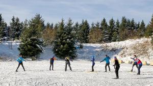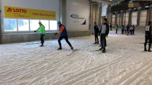 Sonntag ging es dann für die Gruppe zunächst in die Sporthalle, wo wir uns mit Yoga und Gymnastik auf den Tag auf den Skating-Skiern vorbereiteten. In der Oberhofer Skihalle auf den Skating-Skiern angekommen, hieß es dann für alle üben, üben, üben. Zwischen aufgewühltem Schnee und vielen Holländern bemühten sich alle die Skier unter Kontrolle und sich selbst auf den Ski zu halten. Nach der eher schwierigen Tour am Samstagnachmittag konnten Sonntag alle dank der guten Betreuung von Connie, Katja und Stephan und den besseren Schneeverhältnissen in der Oberhofer Skihalle schnelle Geschwindigkeitszuwächse verzeichnen.