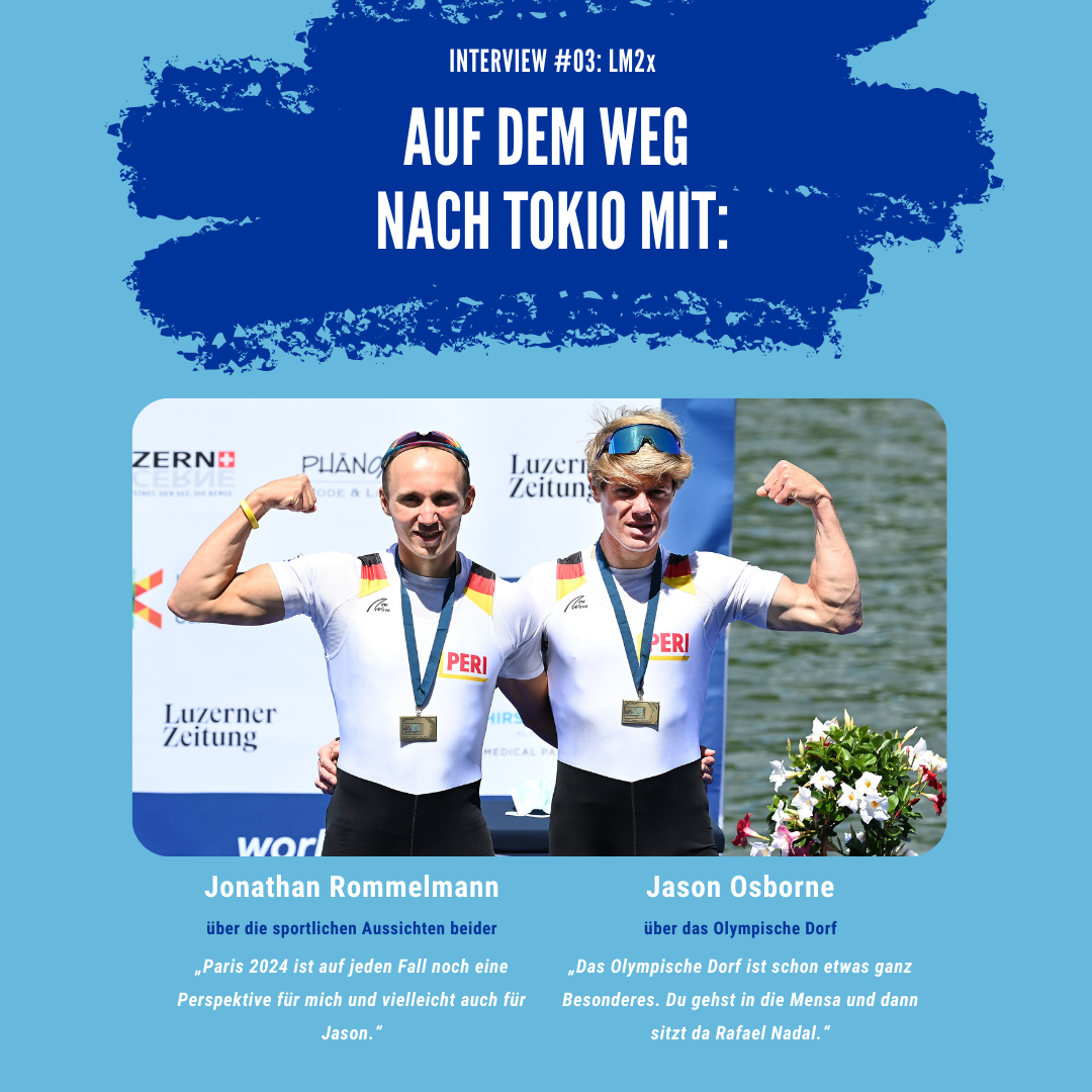 Die Olympischen Spiele von Tokio rücken näher. Sieben Boote des Deutschen Ruderverbandes haben sich für die olympische Regatta vom 23. bis 30. Juli 2021 auf dem Sea Forest Waterway qualifiziert. In Doppel-Interviews stellen wir bis dahin alle DRV-Olympia-Boote vor. Für die dritte Ausgabe des Formats haben wir uns mit Jason Osborne (Mainzer Ruder-Verein 1878 e.V.) und Jonathan Rommelmann (Crefelder Ruder-Club 1883 e.V.) unterhalten. Die beiden bilden den Doppelzweier in der Leichtgewichtsklasse (Mannschaftsschnitt 70 kg; maximal 72,5 kg Einzelgewicht), der zu den Medaillenhoffnungen bei den Spielen zählt. Im Interview sprechen sie darüber, warum sie so schnell zu einem Erfolgsboot wurden, wer von beiden sich schwer mit dem Erreichen des Gewichtslimits tut, und warum nach Tokio das Rudern für beide in den Hintergrund treten wird.