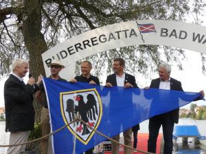 DRV-Vize Moritz Petri hatte eine Verbandsflagge mit Goldrand im Gepäck: Die bekommen Vereine, wenn sie 100 Jahre alt werden. Am Siegersteg in Bad Waldsee überreichte Petri diese Ehrenfahne an Vertreter des Ruderclubs Undine Radolfzell, des Marbacher Rudervereins, Ghibellinia Waiblingen und des Ruderclubs Rheinfelden.
