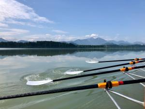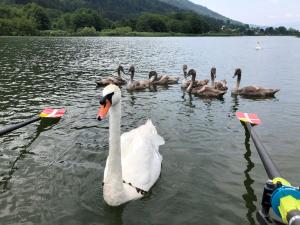 Die Seeumrundung der Ruderboote wurde nur selten von Fahrgastschiffen und Sportbooten gestört. Vor dem Naturschutzgebiet am Seeende erfreute am ersten Rudertag eine Schwanenfamilie mit sieben Jungen die Ruderinnen. Am zweiten Rudertag wurde das heranrollende Gewitter mit Eiskaffee und anderen Erfrischungen abgewettert. Schaumgekrönte Wellen auf der Rückfahrt zum Steg des RV Villach forderten die volle Konzentration der Ruderinnen und ihrer Steuerfrauen.