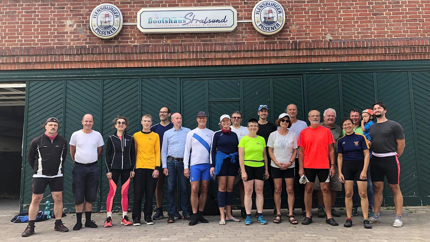 Der Praxis-Nachmittag, der die Teilnehmer dann in die Coastal-Boote bringen sollte, begann notwendigerweise mit etwas Theorie. Rainer Engelmannmachte die Runde mit der Küstenruderordnung, den DRV-Sicherheitsregeln „für Ruderfahrten an der Ostseeküste mit Förden, Bodden- und Haffgewässern“ vertraut. Was man dann alles im Umgang mit den Booten wissen sollte, die in reicher Auswahl zur Verfügung standen, lernte man dann im Selbstversuch. Unterschiedlich zu bedienende Steueranlagen waren die größte Herausforderung. Viel Spaß brachte es, durch den (Nicht-)Einsatz des beweglichen Schwerts, das Kurshalten bzw. die Wendigkeit des Vierers grundlegend zu beeinflussen. Große Wellen gab es am Sonntagnachmittag im Strelasund leider nicht.