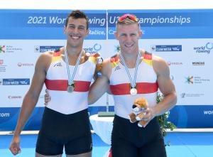 Mit der schnellsten Qualifikationszeit konnten sich Fabio Kress (Akademischer Ruderclub Würzburg e.V.) und Melvin Müller-Ruchholtz (Erster Kieler Ruder-Club von 1862 e.V.) zu Recht Hoffnung auf Gold im leichten Doppelzweier machen. Nach einem schnellen Start setzte sich das deutsche Boot bereits nach 250 m mit einer Länge von der Konkurrenz aus Frankreich und Belgien ab. Diesen Vorsprung nahmen sie mit auf die zweite Streckenhälfte. Auf den dritten 500 m konnten die Athleten von Trainer Simon Frank weiter Wasser zwischen sich und die Verfolger bringen. Mit knapp drei Sekunden Vorsprung gingen sie als Erster auf die letzte Teilstrecke. Den Angriff der Franzosen auf der Nebenbahn 250 m vor dem Ziel wehrte das deutsche Duo erfolgreich ab. Mit einer halben Länge Vorsprung gewinnen die Deutschen verdient die Goldmedaillen und dürfen sich als neue U23-Weltmeister feiern lassen. „Seit ich mit dem Rudern begonnen habe, war es immer mein Traum, Weltmeister zu werden. Es ist ein unglaubliches Gefühl, das muss ich jetzt erst einmal verdauen“, freut sich Melvin Müller-Ruchholtz. „Die Jungs haben das heute super gemacht“, freut sich Bielig.
