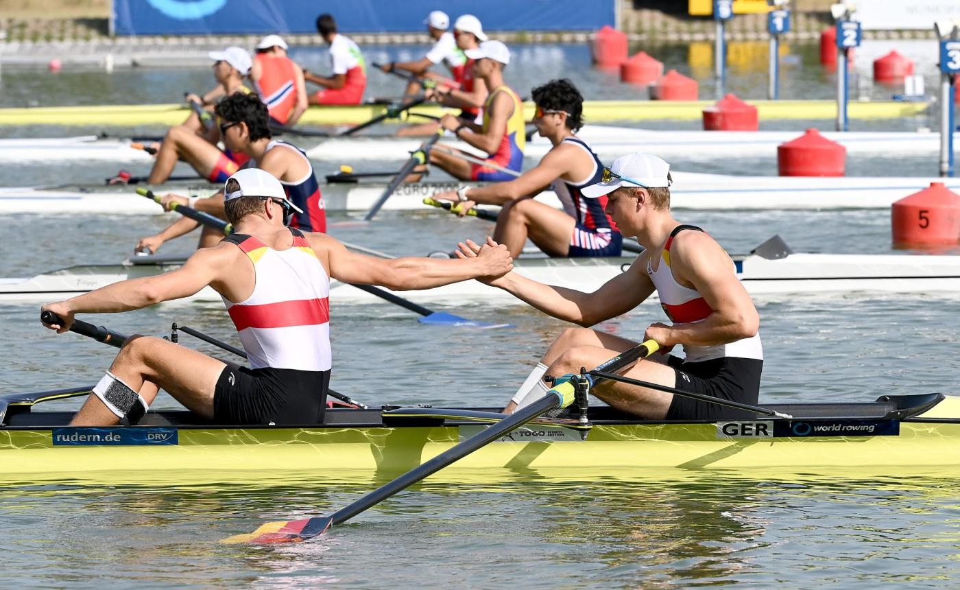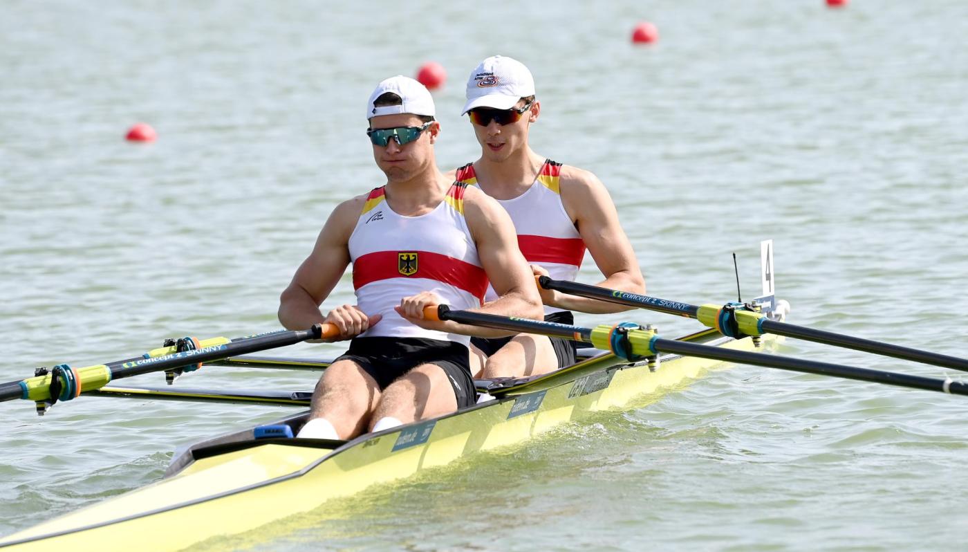 Auch Finn Stäblein und Adrian Groth (Würzburger RV Bayern von 1875/1905 e.V./ RK am Wannsee e.V.) ließen ihren Konkurrenten im Vorlauf des Doppelzweiers keine Chance. Das Duo konnte sich auf den ersten 500 m schon deutlich vom Rest des Feldes lösen und das Rennen mit knapp 13 Sekunden Vorsprung vor der Schweiz gewinnen. Für die beiden geht es am Samstag im Halbfinale weiter.