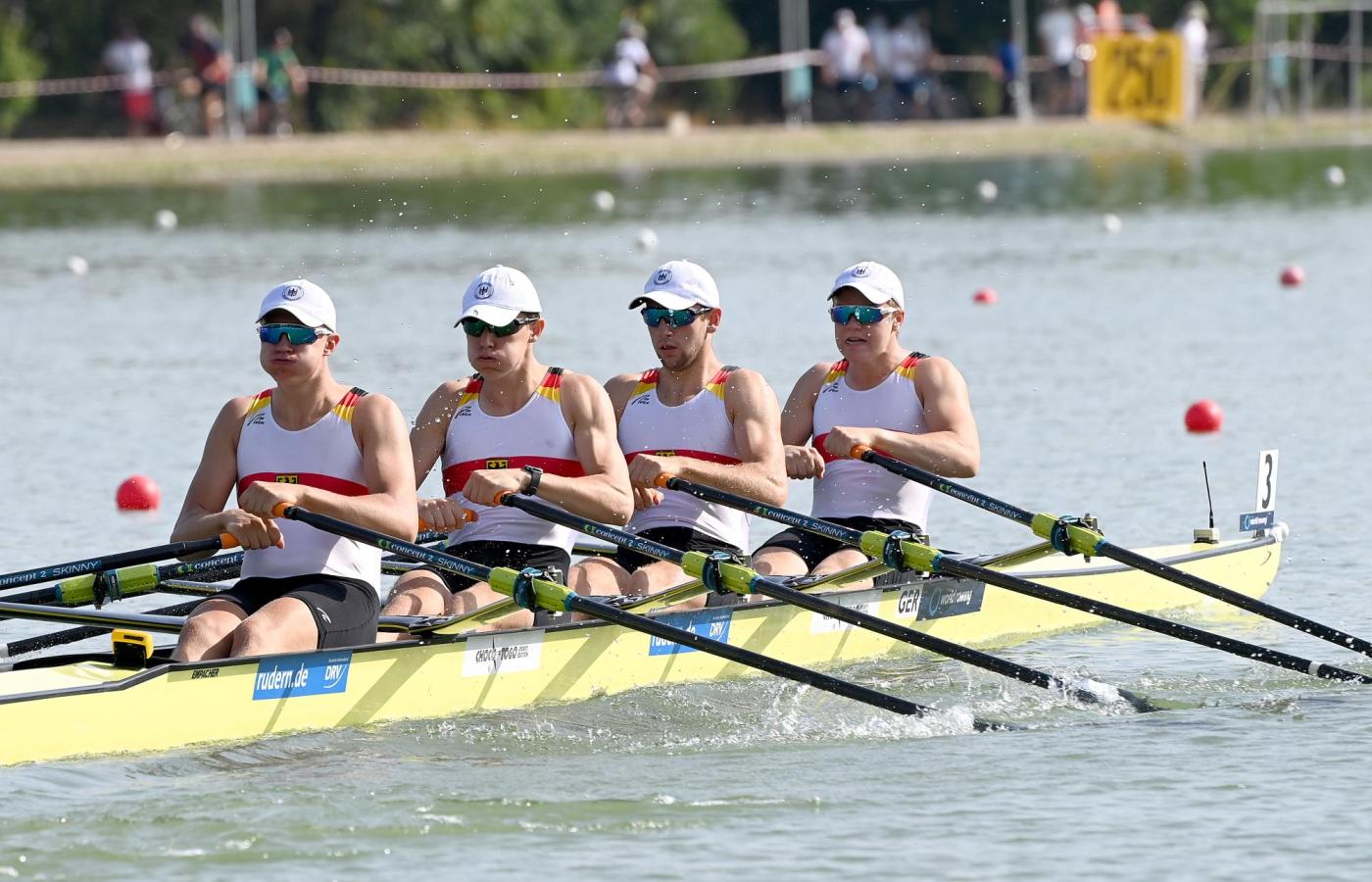 Ein Ausrufezeichen hat der Junioren-Doppelvierer in seinem Vorlauf gesetzt. Timo Strache, Adrian-Nick Bastian, Sydney Garbers und Schlagmann Maximilian Pfautsch (Hannoverscher Ruder-Club von 1880 e.V./ SC Magdeburg e.V. Abteilung Rudern/ Hannoverscher Ruder-Club von 1880 e.V./ Hallesche-Ruder-Vereinigung Böllberg v. 1884 u. Nelson v. 1874 e.V. im SV Halle) haben das Rennen vom Start weg dominiert und sind mit mehr als acht Sekunden Vorsprung vor Belgien als einziges Boot direkt ins Halbfinale eingezogen.