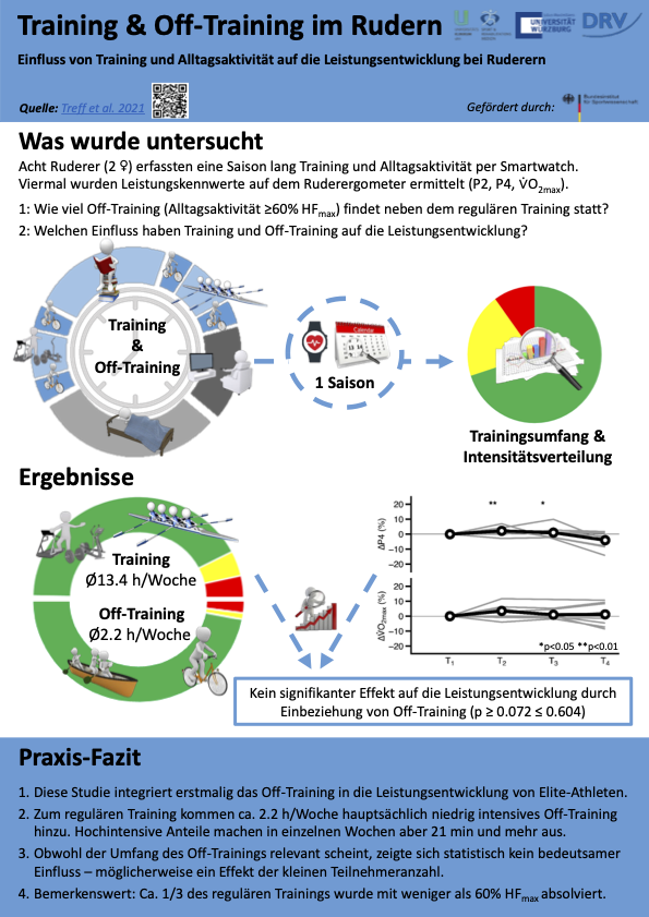 Die Ergebnisse zeigten, dass die Einbeziehung von Off-Training den Umfang (14-19%) und die Trainingsbeanspruchung (TRIMP, 11%) signifikant veränderten. Die Verteilung der Trainingsintensität änderte sich zwar nicht auf Gruppenebene, aber auf individueller Ebene veränderte sie sich teilweise deutlich. Bemerkenswert ist auch, dass die Studienteilnehmer:innen ein Drittel ihres regulären Trainings mit Intensitäten von weniger als 60% der maximalen Herzfrequenz absolvierten und somit unterhalb der ersten Intensitätszone (Im DRV bezeichnet als „Technik / Kompensation“). Diese Zone gilt allgemein als Minimum des wirksamen Herzkreislauftrainings.