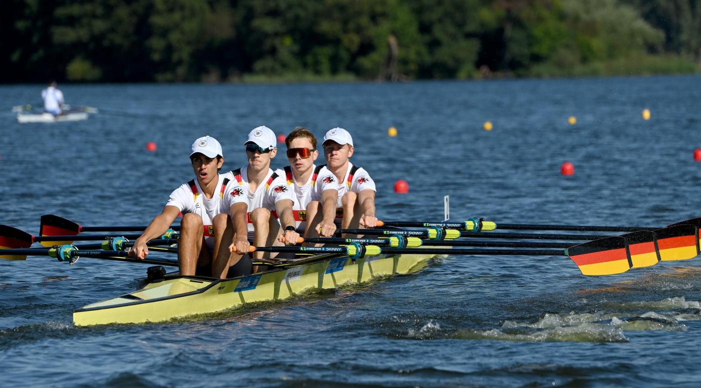 Vom Start bis ins Ziel führte der leichte deutsche Männer-Doppelvierer beim Bahnverteilungsrennen. Das sind exzellente Aussichten für das Finale morgen, vor allem weil der Vorsprung für mit knapp neun Sekunden mehr als komfortabel war. Somit können Oskar Kroglowski (Erster Kieler Ruder-Club von 1862 e.V.), Adrian Reinstädler (Frankfurter Rudergesellschaft Germania 1869 e.V.), Zeno Robertson (Der Hamburger und Germania Ruder Club e.V.) und Schlagmann Jacob Waldhelm (Ruder-Club 'Allemannia von 1866') mit Recht auf Gold hoffen.