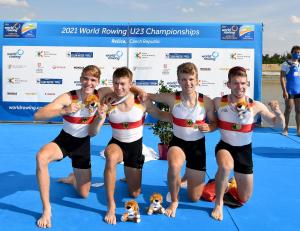 Paul Berghoff, Elrond Kullmann, Paul Krueger und Schlagmann Tom Granitz (SC Magdeburg e.V. Abteilung Rudern, Berliner Ruder-Club e.V., Dresdner Ruder-Club 1902 e.V.) haben sich als Zweiter für das Finale im Doppelvierer qualifiziert. Während die Niederländer schon frühzeitig einen kleinen Vorsprung rausruderten, lieferten sich die Deutschen und Polen einen spannenden Zweikampf um die Ränge zwei und drei. Am Ende überquerten die Jungs von Trainer Dirk Brockmann 13 Hundertstel vor der Konkurrenz aus dem Nachbarland die Ziellinie.