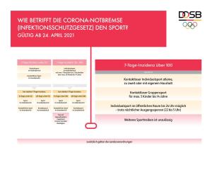 Der Deutsche Olympische Sportbund hat auf seinen Social-Media-Kanälen bei Facebook und Instagram eine Grafik geteilt, die eine Übersicht der aktuellen Bestimmungen für den Sport im Rahmen der „Corona-Notbremse“ darstellt.