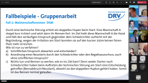 Mit einem interaktiven Quiz unterhielt Lucas Hesselmann die Teilnehmer in seinem Bericht zur Aktualisierung der Jungen- und Mädchen-Bestimmungen des Deutschen Ruderverbandes. Tiefe Einblicke, mit Hinblick auf Streitfälle des Verbandsrechtsausschuss, gab Stefan Schröter. Den Abschluss machte Willi Rüdel zur Regelkunde. In Kleingruppen wurden hier verschiedene Lösungsfindungen von den Wettkampf-Ressortmitgliedern betreut und anschließend im Plenum vorgestellt.