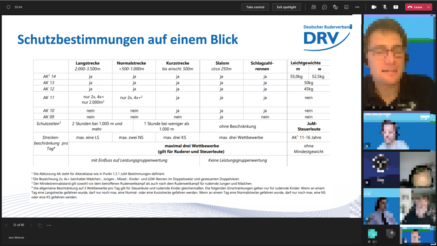 Am vergangenen Samstag haben die Wettkampfrichter-Fortbildung sowie die Tagung der Regattaveranstalter des Deutschen Ruderverbandes digital stattgefunden. Tobias Weysters (Ressortvorsitzender Wettkampfsport) führte durch die von Jens Wiesner und Michael Keschka organisierte Veranstaltung. Als Referenten der jeweiligen Themenschwerpunkte unterstützten auch die anderen Ressortmitglieder dabei, die zahlreichen Teilnehmer durch den Tag zu begleiten und die anschließenden konstruktiven Diskussionsrunden zu leiten.
