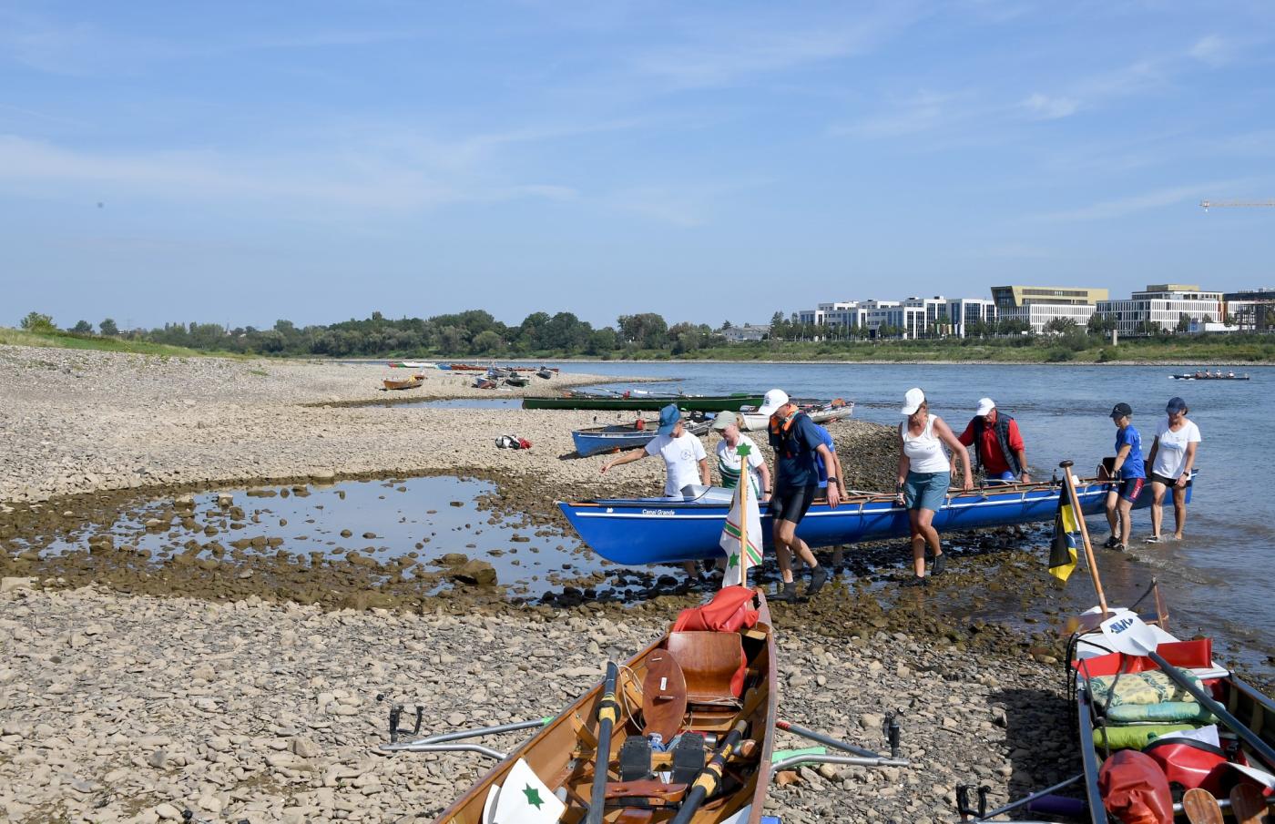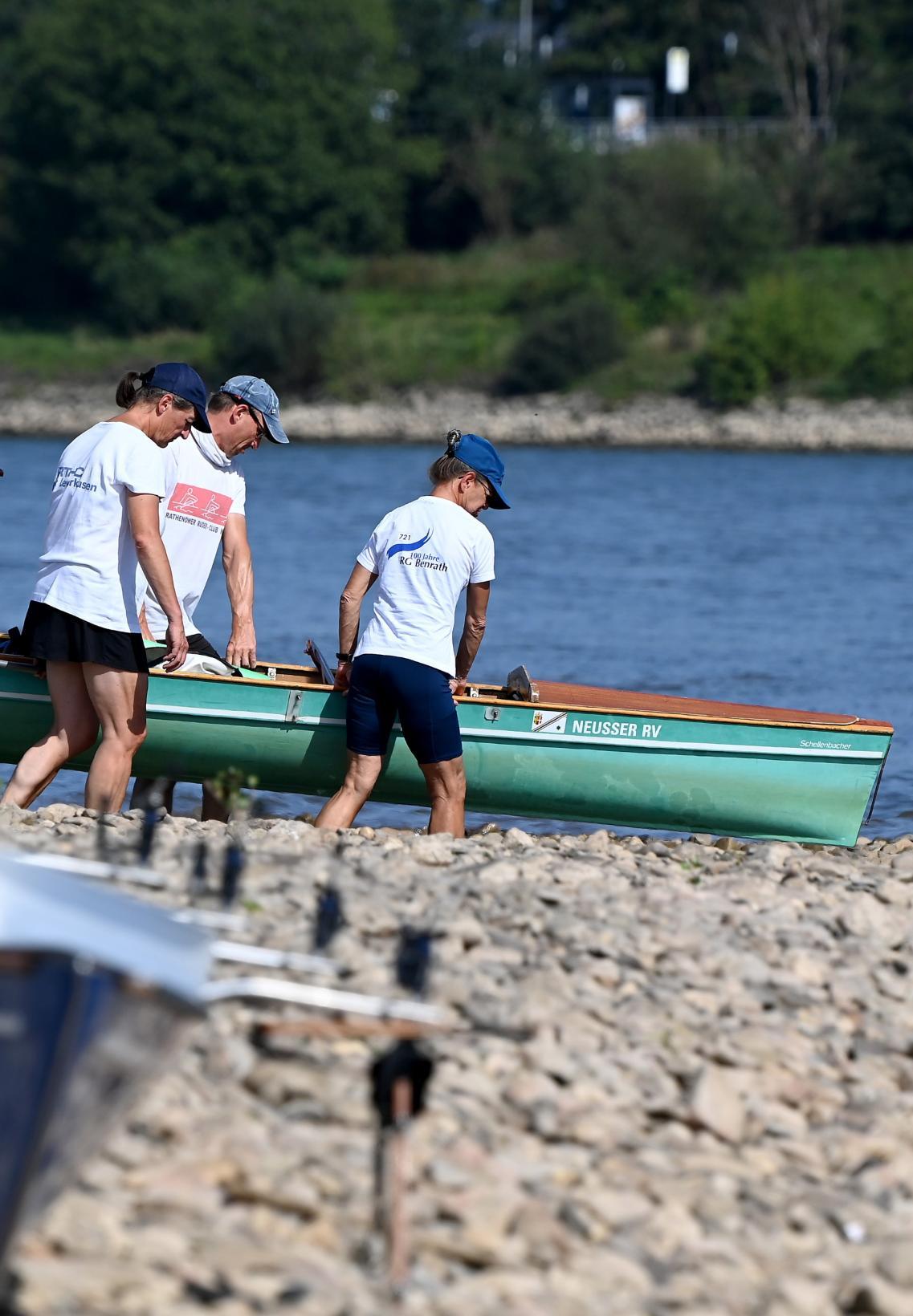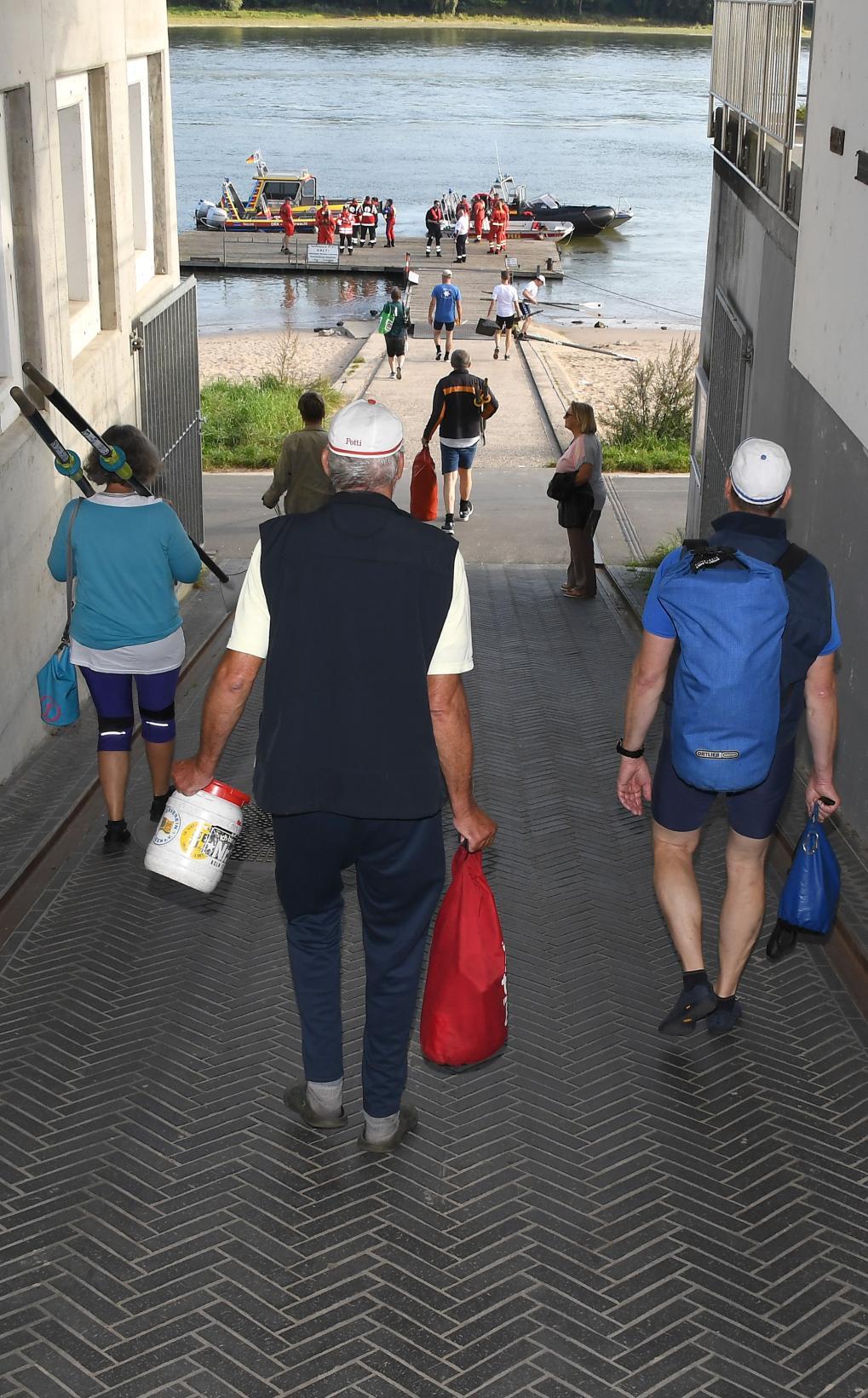 Aufgeteilt in kleine Gruppen eskortierten Polizei, DRK Wasserwacht und die DLRG die Ruderflotte Richtung Neuss, vorbei an allen bekannten Sehenswürdigkeiten von den Kranhäusern, über die Altstadt bis zum Dom. Die Mittagspause verbrachte die ganze Flotte bei der Dormagener Rudergesellschaft „Bayer“, versorgt von einem großen Helferteam der Dormagener und Neusser Ruderer mit Suppe und Kuchen bei sehr guter Stimmung. Bei so vielen Booten war an die Benutzung des Steges, außer für das einzige Kirchboot gar nicht zu denken, weil An- und Ablegen gleichzeitig stundenlang gedauert hätte. Alle mussten ihre Boote mit “Badenudeln” vorsichtig am langen Kiesstrand ablegen. Am späten Nachmittag trudelten alle Boote im Neusser Sporthafen ein. Schnell wurden viele Boote verladen.
