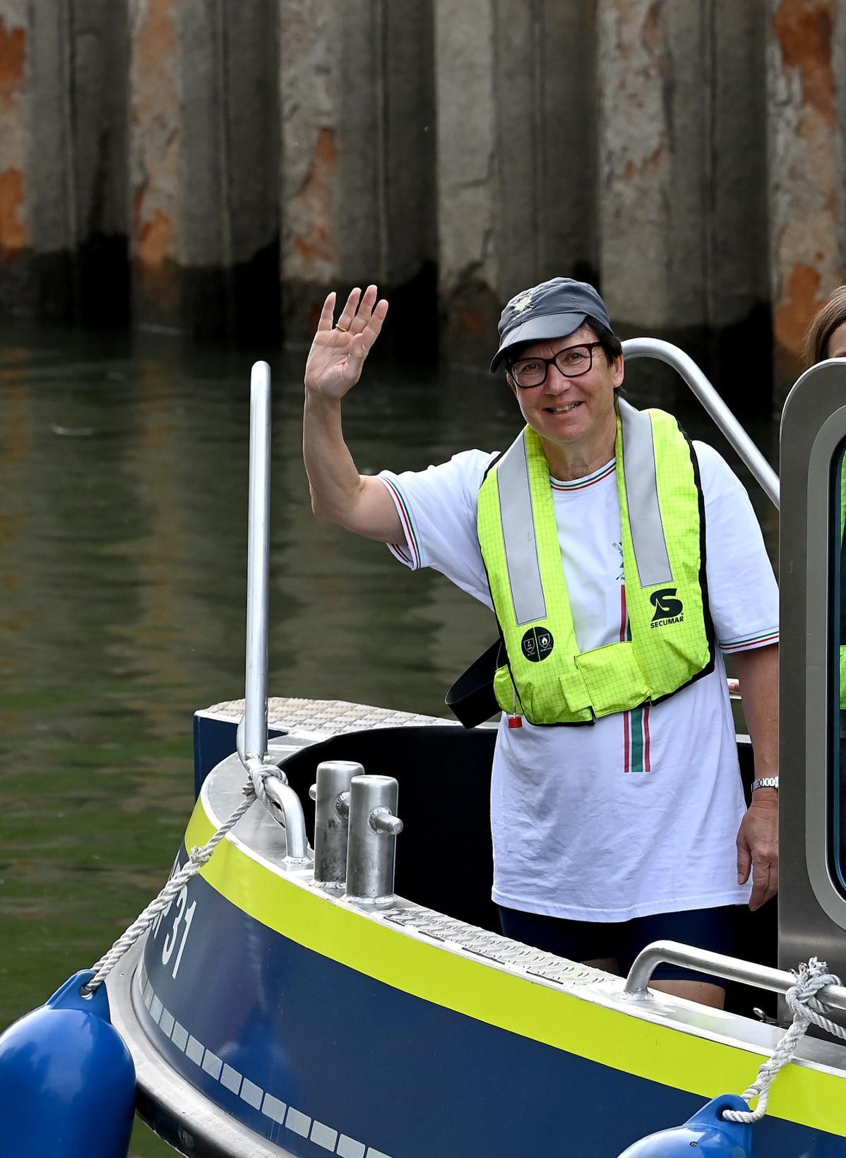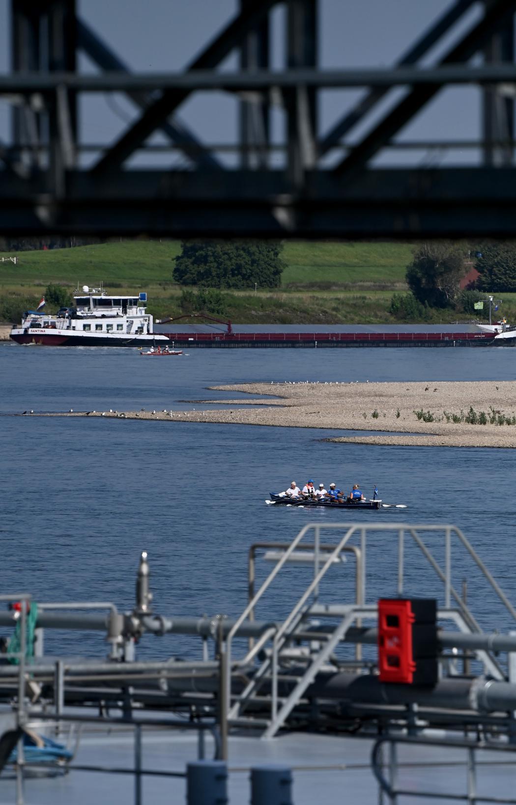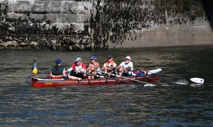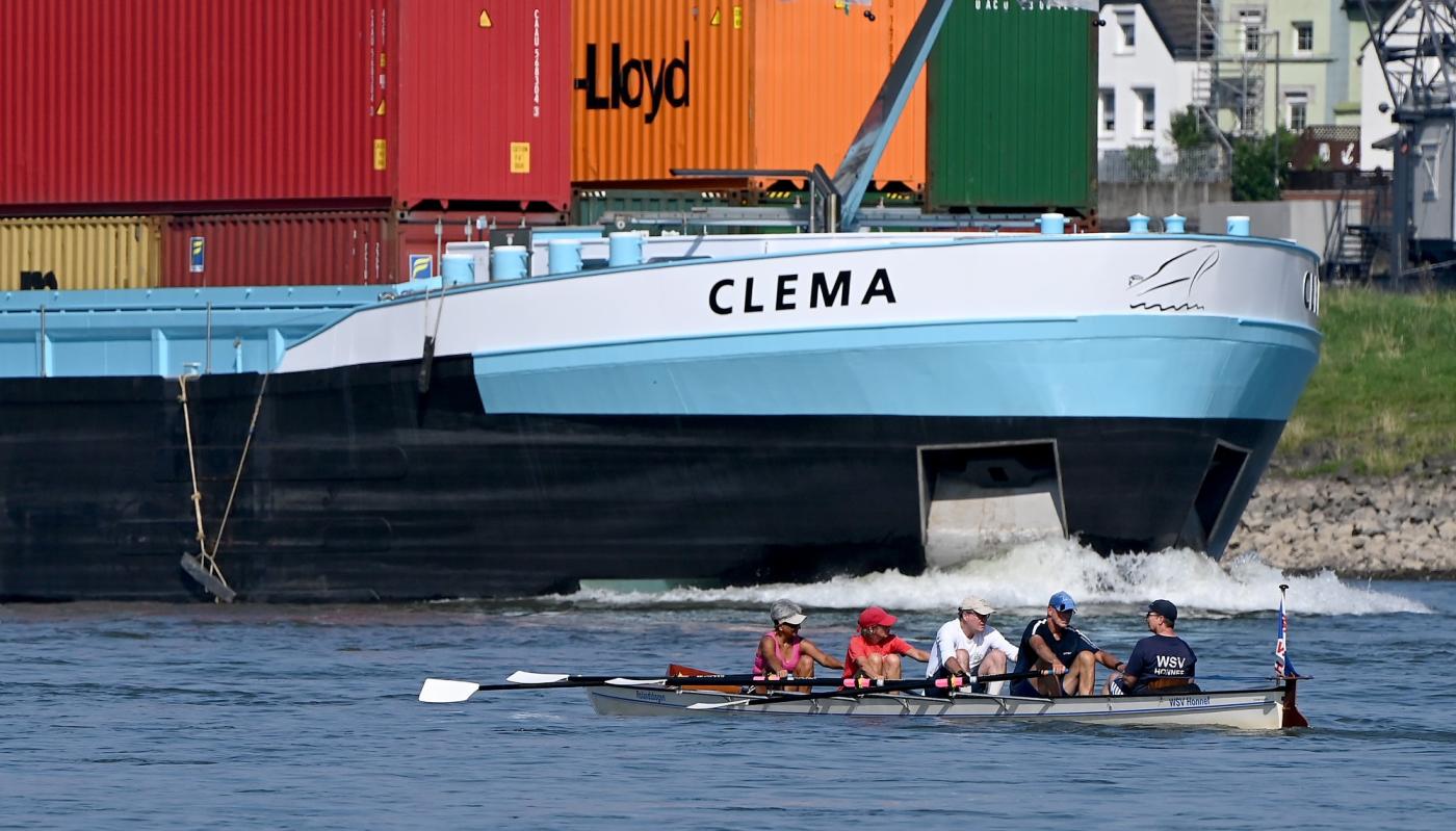 Aufgeteilt in kleine Gruppen eskortierten Polizei, DRK Wasserwacht und die DLRG die Ruderflotte Richtung Neuss, vorbei an allen bekannten Sehenswürdigkeiten von den Kranhäusern, über die Altstadt bis zum Dom. Die Mittagspause verbrachte die ganze Flotte bei der Dormagener Rudergesellschaft „Bayer“, versorgt von einem großen Helferteam der Dormagener und Neusser Ruderer mit Suppe und Kuchen bei sehr guter Stimmung. Bei so vielen Booten war an die Benutzung des Steges, außer für das einzige Kirchboot gar nicht zu denken, weil An- und Ablegen gleichzeitig stundenlang gedauert hätte. Alle mussten ihre Boote mit “Badenudeln” vorsichtig am langen Kiesstrand ablegen. Am späten Nachmittag trudelten alle Boote im Neusser Sporthafen ein. Schnell wurden viele Boote verladen.