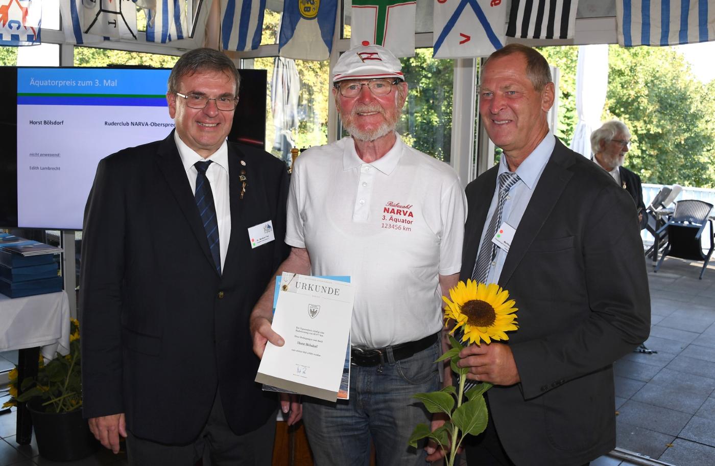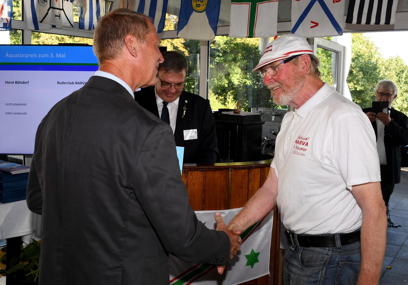 Im Anschluss schlüpfte dieser in seine Rolle als Präsidiumsmitglied des DRV und übernahm zusammen mit Dr. Bernhard Trui, dem Leiter des Teilressorts Wanderrudern, die feierlichen Ehrungen. Mit viel Hingabe übergab er den 28 Preisträgern des Äquatorpreises ihre Nadeln und Urkunden. Jeder von ihnen hat in seinem Leben mindestens einmal über 40.077 km im Ruderboot zurückgelegt. Die Preisträger haben also sinnbildlich den Äquator umrundet.