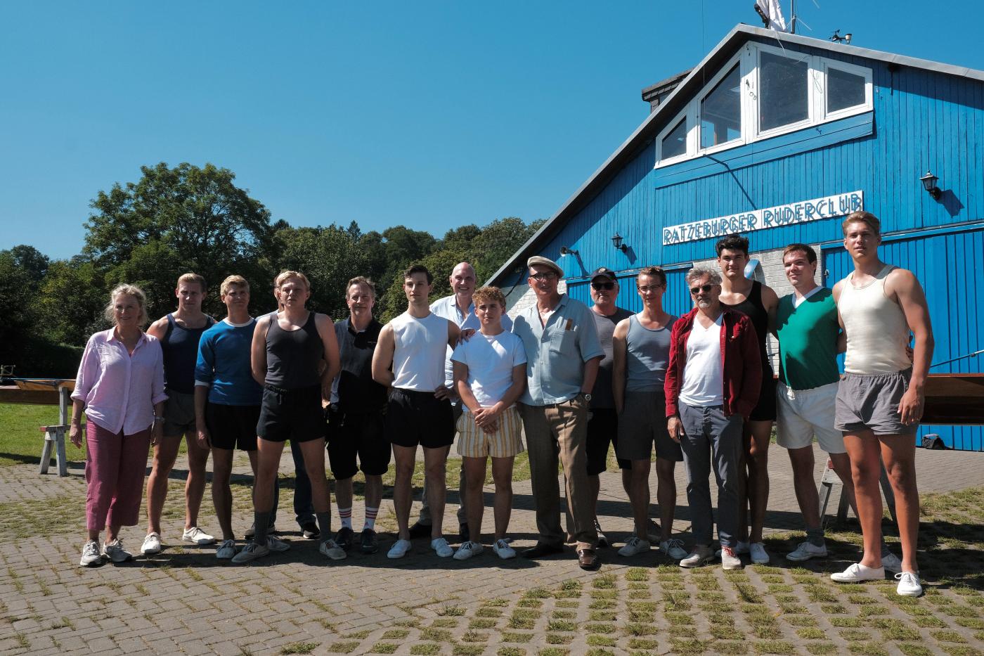 Die Besetzung des Films klingt vielversprechend. Karl Adam wird verkörpert von Oliver Masucci, einem der bekanntesten Schauspieler in Deutschland, spätestens seit seiner Hauptrolle in der Netflix-Erfolgsserie „Dark“. Klaus Bittner, 86 Jahre alt und der letzte noch lebende Sportler aus dem Rom-Achter, hat Oliver Masucci in Adam-Maske mit der typischen Schiebermütze am Set im Bootshaus des Ratzeburger Ruderclubs zum Austausch getroffen. Die Rolle des Hans Lenk spielt Felix Kammerer, der mit der Rolle des jungen Soldaten Paul Bäumer in der Verfilmung von „Im Westen nichts Neues“ seinen internationalen Durchbruch feierte. Als Ulla ist Svenja Jung („Deutschland ´89“, „Die Kaiserin“) zu sehen. Mit Axel Milberg und Heino Ferch sind weitere bekannte Schauspieler dabei.