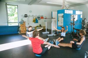 Station 1 bereitet fast spielerisch die Interessierten auf das Rudern vor: 2 Wassereimer oder Gewichte heben und diese erhöht abstellen sensibilisiert, dass die Arme beim Beginn des Zuges gestreckt sein müssen. Eine Übung im Sitzen auf dem Pilatesball lenkt die Aufmerksamkeit auf die Rumpfmuskulatur, die u. a. zum Bootstellen gebraucht wird. Viel Spaß macht die „Polonaise“ als gehender Vierer mit geschlossenen Augen, der von der Ausbilderin durch den Trainingsraum geführt wird. Diese Erfahrung soll zeigen, dass gemeinsame, gleichzeitige Bewegungen gefordert werden. Kernstück der ersten Station sind aber die ersten Schläge auf dem Ergo, bei denen die Ruderbewegung mit aufeinander aufbauenden Teilbewegungen geübt und gezeigt wird, dass niemals Arme und Beine gleichzeitig gebeugt werden.