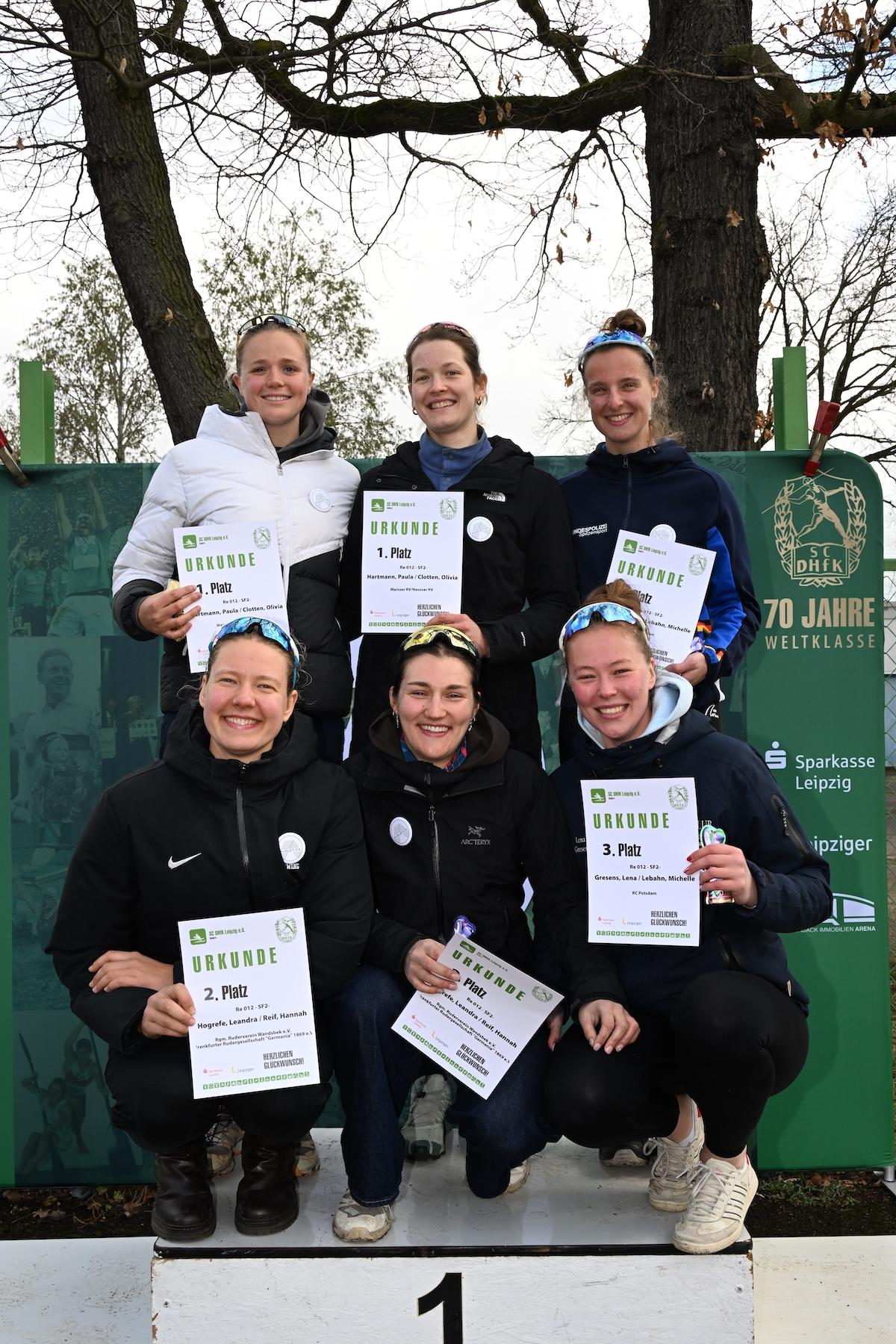 Bei den Riemerinnen gab es im Zweier ohne den Sieg für Paula Hartmann und Olivia Clotten. Die beiden erfahrenen Sportlerinnen kamen in 23:22 Minuten ins Ziel und waren damit drei Sekunden schneller als die kurzfristig zusammengestellte Paarung Leandra Hogrefe und Hannah Reif (23:25), die ebenfalls eine gute Fahrt hin gelegt hatte. Rang drei sicherten sich Lena Gresens und Michelle Lebahn (23:39). Mit Sara Grauer/Alina Krüger (23:45) und Melisa Mujic/Marie Gelbert (23:50) freuten sich B-Kader-Athletinnen über die Ränge vier und fünf. Da etliche starke Riemerinnen noch fehlten, waren die Ergebnisse allerdings nicht allzu aussagekräftig.