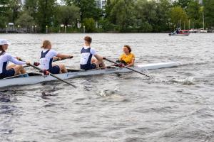 Am sonnigen Mittwochnachmittag traf Ministerin Britta Ernst, eskortiert von den Sportschülern der Sportschule Potsdam im Seekrug, dem traditionsreichen Bootshaus der Ruderer, ein. Die Präsidentin des Ruder-Club Potsdam e.V., Katrin Eggebrecht begrüßte die Ministerin und bot ihr den Steuerplatz im Achter an. Frau Ministerin Ernst stand ihrem Ehemann, Bundeskanzler Olaf Scholz, selbst passionierter Ruderer, in nichts nach und meisterte ihren ersten Einsatz als Steuerfrau mit Bravour. Beeindruckt von der Kraft in einem solchen Boot, beantwortete sie im nachfolgenden Talk, verschiedene Fragen der jungen Ruderer.