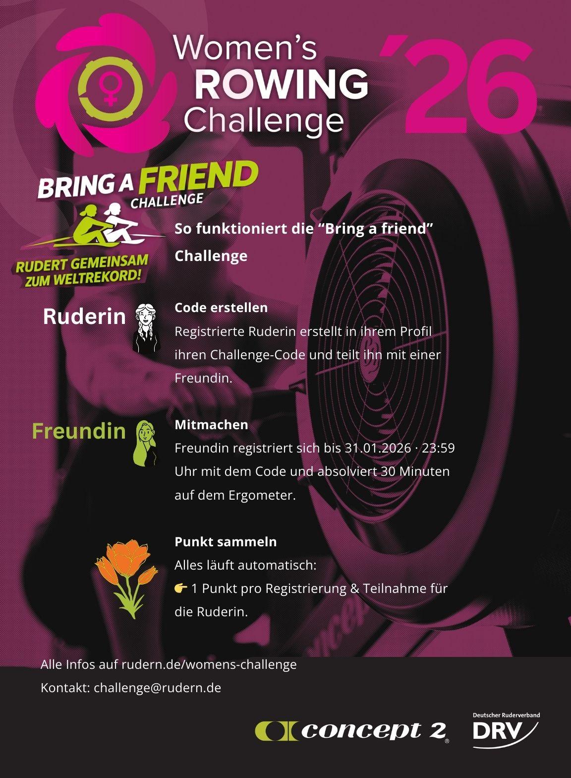 Jede teilnehmende Ruderin ist eingeladen, eine weitere Sportlerin für die Women’s Rowing Challenge zu gewinnen. Diese müssen den Challenge-Code der Botschafterin bei der Registrierung eingeben. Ob aktive Vereinsruderin, ehemalige Athletin oder sportlich interessierte Freundin – die Teilnahme ist offen und unabhängig von Leistungsniveau, Alter oder Vereinserfahrung. Die neuen Anmeldungen durch die Challenge-Managerinnen fließen natürlich auch in die Wertung ein. Diese sind das Rückgrat der Challenge und die Botschafterin per se.
