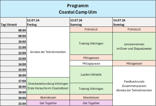 Das Coastal Rowing Camp des Umer Ruderclub Donau in Zusammenarbeit mit der DRJ bietet dir die Möglichkeit ein tolles Wochenende mit deinen Ruderkameraden zu verbringen. Ihr lernt den Beach Sprint kennen, das heißt ihr Fahrt einen Bojenparkour auf Zeit ab. Am Anfang kann das ziemlich überfordernd sein, deshalb fangen wir erstmal auf einem See an. In diesem Coastalcamp lernst du erstmal Coastalboote und den Bojenparkour kennen. Dann werden wir in vielen kleinen Wettkämpfen Stück für Stück euch schneller machen, und an den Coastalspezifischen Feinheiten arbeiten. Also das Einsteigen, das Steuern und die Wenden. Damit seid ihr dann gewappnet für einen kleinen Wettkampf am Sonntag. Das Ganze lernt ihr von Beach Sprint Erfahrenen Sportlern und Trainern.