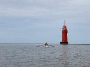 Die Windvorhersage für Montag verbesserte sich zu Gunsten der Fahrtenplanung. Der Höhepunkt der Fahrt war möglich geworden: Fahrtziel ist der Leuchtturm Robbenplate! Nach den notwendigen Vorbereitungen, insbesondere des Einsetzens der Boote im zunehmend schlickigen Bereich des Strandbades, legten die drei Vierer um 9 Uhr ab. Im Gegensatz zur ersten Tour mit Kioskbesuch unterwegs wurde genügend Wasser und Proviant an Bord verstaut. Mit ablaufendem Wasser querten die Boote zunächst das Fahrwasser der Weser vor den großen Hafenanlagen: die Ruderer haben das Fahrwasser auf jeden Fall zu meiden. Die Passage der Bremerhavener „Havenwelten“, der Columbus-Kaje (heute ohne Kreuzfahrtschiffe) und den scheinbar unendlich langen Container- Terminals bot ein beeindruckendes Panorama von Bremerhaven.