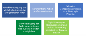 Der DRV-Vorstand zum Vorgehen: „Es funktioniert tatsächlich nur, wenn wir alle einbinden. Einen ersten Anstoß machte das neue Präsidium im November auf seiner konstituierenden Sitzung. Diesen Partizipationsprozess bringt die Strukturkommission nun in Gang: mit vielen Dialogforen, auf denen alle Vereine gehört werden – denn die Vereine sind unser Souverän. Wir sind überzeugt, dass es eine Stärke ist, so nah an den Mitgliedern zu sein.“
