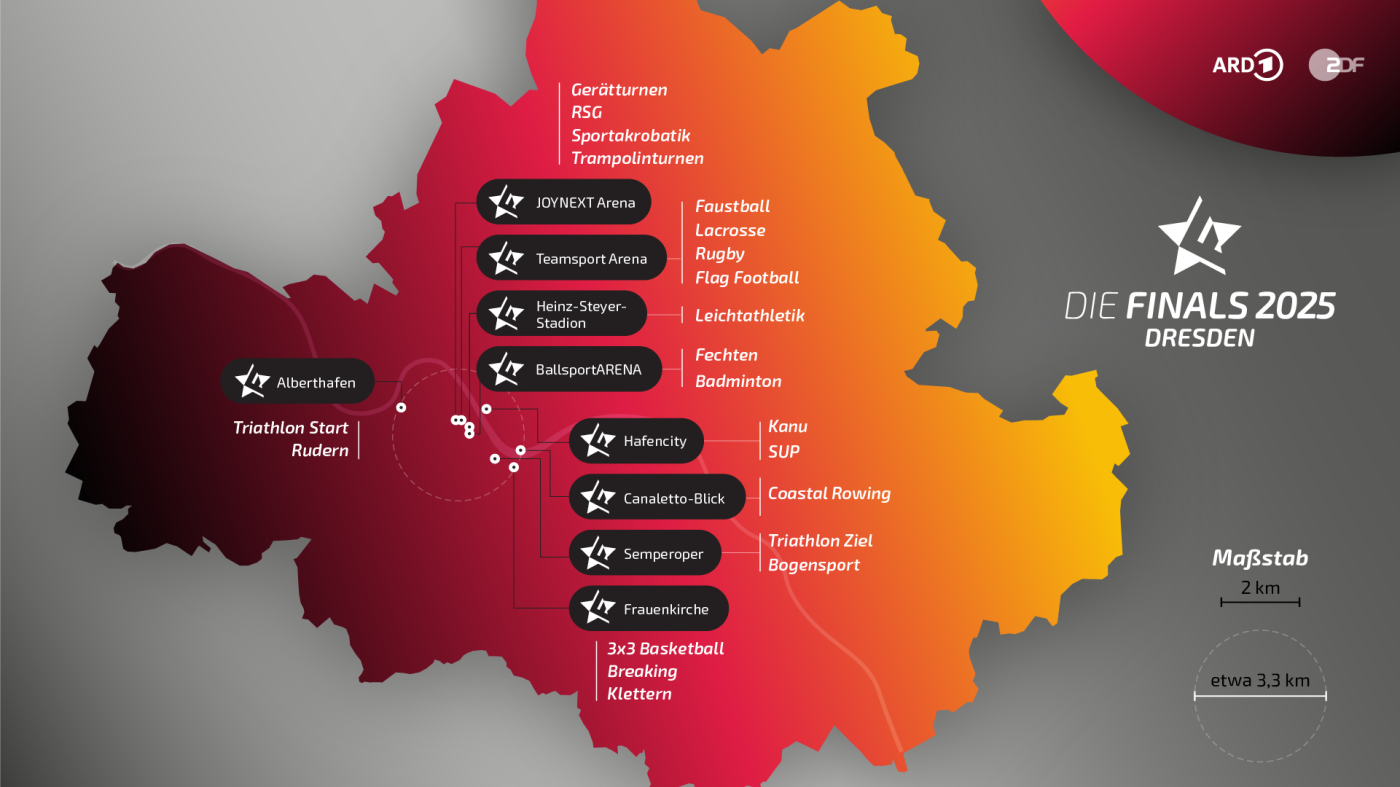Dresdens Erster Bürgermeister und Sportbürgermeister Jan Donhauser hat auf einer Pressekonferenz im Heinz-Steyer-Stadion einen Überblick zu den Vorbereitungen der Finals 2025 gegeben und die neuen Medaillen vorgestellt. Die Stadt Dresden steht ab dem 31. Juli ganz im Zeichen des deutschen Spitzensports. Die meisten Wettkämpfe sind kostenfrei und ohne Ticket zu sehen: Breaking, 3x3 Basketball und Speed-Klettern vor der Frauenkirche, Bogensport und der Zieleinlauf des Triathlon vor der Semperoper, Kanu und SUP in der Hafencity, Rudern im Alberthafen, Coastal Rowing am Canaletto-Blick, 7er-Rugby, Flag Football, Faustball und Lacrosse in der eigens errichteten Teamsport-Arena. Beim Badminton werden kostenfreie Tickets ausgegeben. Für die Fecht- und Turn-Wettkämpfe gibt es noch Eintrittskarten. Die Leichtathletik im Heinz-Steyer-Stadion meldet für Samstag und Sonntag ausverkauft, für Donnerstag und Freitag gibt es noch Tickets, dann sind Plätze in den Kurven kostenfrei erhältlich.