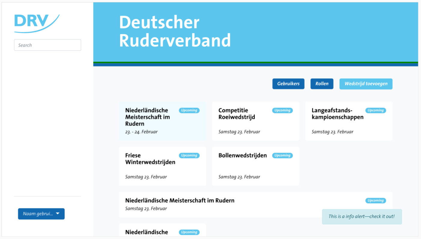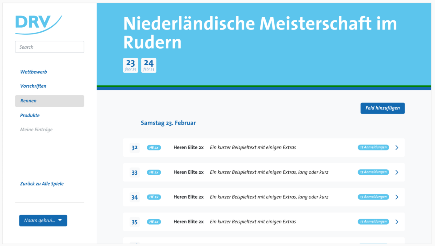 Im Pflichtenheft des neuen Meldeportals standen wichtige Funktionen wie moderne Benutzerführung, automatisches “responsives” Design, automatische Zahlungsabwicklung, Verwaltung von Um-/Nach-/Abmeldungen sowie Meldungen von Nicht-DRV-Mitgliedern wie ausländische Teilnehmer, Schülerruderer, Hochschul-Ruderer oder auch Cross-Fit-Teilnehmer etc.
