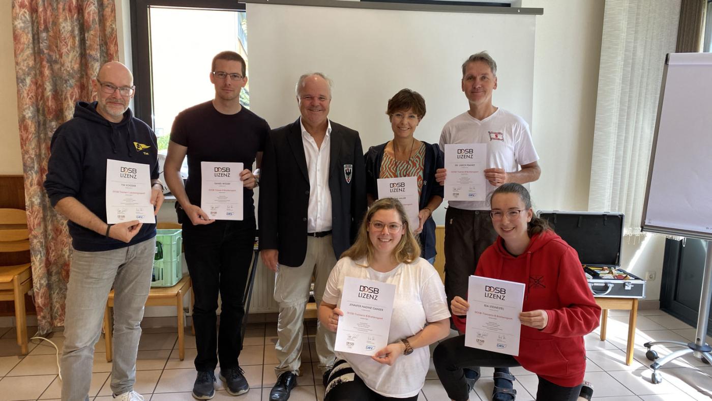 Der im Mai diesen Jahres begonnene Ausbildungskurs des DRV endete erfolgreich am 3. September 2023 für 6 engagierte Ruderinnen und Ruderer mit Übergabe der DOSB Lizenzen Trainer B Breitensport Rudern durch Reinhart Grahn, Vorsitzender des Fachressorts Bildung, Wissenschaft und Forschung.