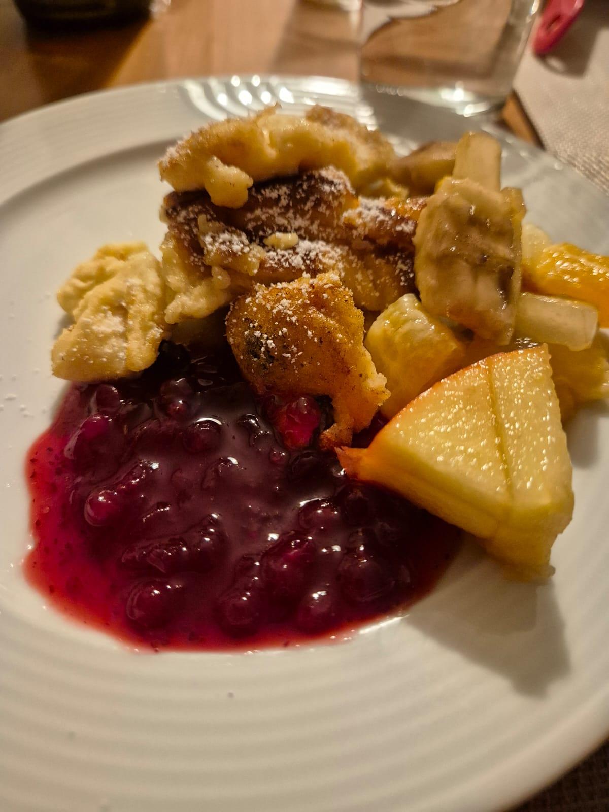 Zubereitung: Teig anrühren, Eischnee unterheben, in Butter ausbacken, zerteilen, karamellisieren, mit Rum flambieren, mit Puderzucker bestäuben – fertig.