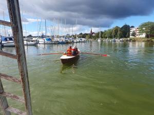 Auch stand das Rudern und Steuern in Wellen und Strömungen auf dem Programm: Bei einer der Ausfahrten am Samstag kam heftiger Wind auf. Erst suchten wir Schutz in einem Hafen vor den Windböen, dann entschieden wir uns, die Wellen spitz bzw. Winkel von 45 Grad zu nehmen. Kurzzeitig wurde einem mulmig, ob der See bei dieser Windstärke noch zu überqueren sei. Vieles hängt aber immer auch von der Mannschaft ab. Das Anlegen an Brücken bzw. Stegen und Manövrieren auf engem Raum wurde geübt, dabei war eine enge Straßenbrücke mit kräftiger Gegenströmung zu überwinden.