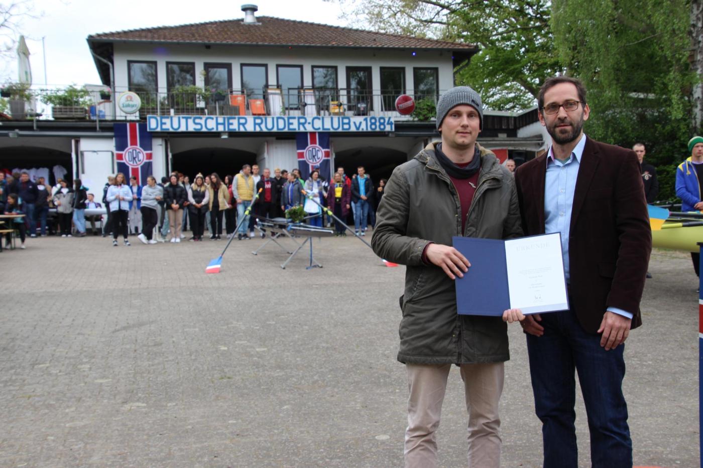 Das Anrudern beim Deutschen Ruder-Club von 1884 e.V. in Hannover mit der Achter-Bootstaufe des ukrainischen U19-Nationalteams bildete am 30. April die feierliche Kulisse für eine besondere Ehrung. Frederik Stoll wurde vom Sportdirektor des Deutschen Ruderverbandes, Mario Woldt, mit der DRV-Trainernadel in Silber ausgezeichnet. „Den zeitlichen und persönlichen Einsatz, den ehrenamtliche Trainer wie Frederik Stoll im Leistungssport einbringen und der in solchen Erfolgen mündet, möchte der DRV mit dieser Ehrung wertschätzen“, so Mario Woldt in seiner Laudatio. Stoll habe als Trainer hervorragende nationale Leistungen in der Heranbildung von Rudermannschaften erbracht. „Viele seiner ehemaligen Schützlinge in der U19-Altersklasse, darunter zum Beispiel U23-Vizeweltmeister Aaron Erfanian, rudern inzwischen erfolgreich in der U23-Altersklasse mit auf internationalen Titelkämpfen“, lobte Woldt.