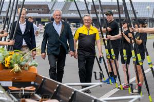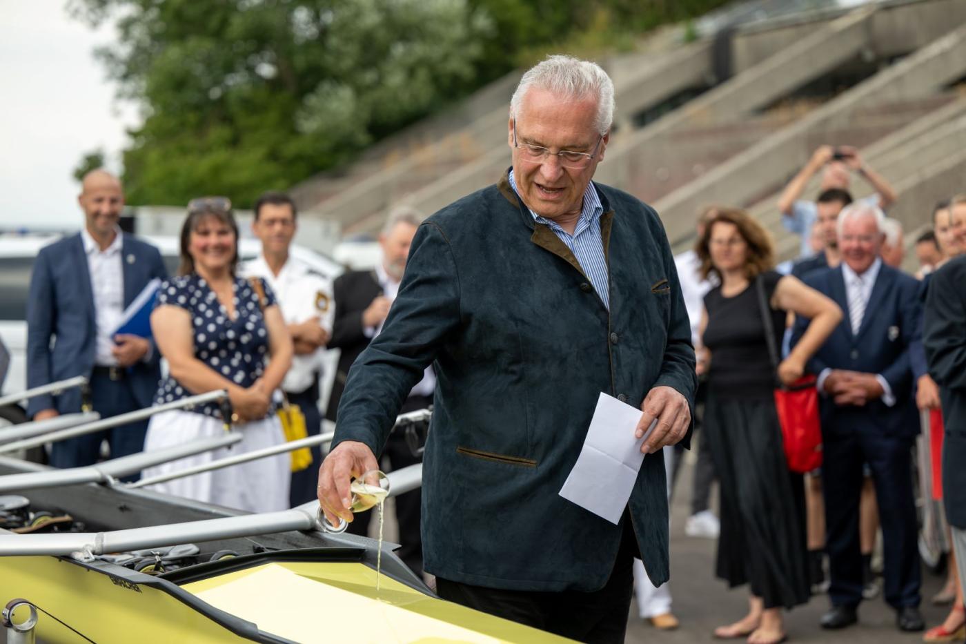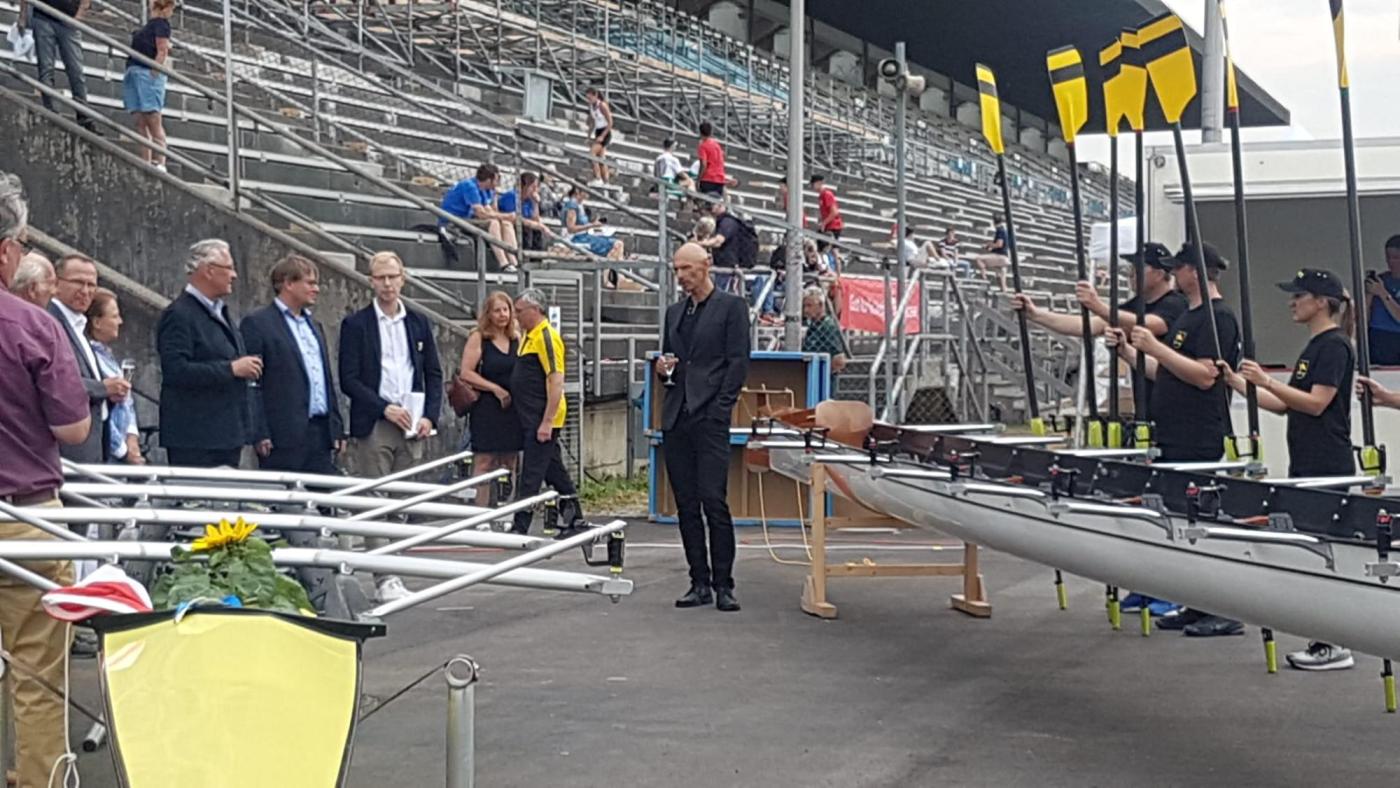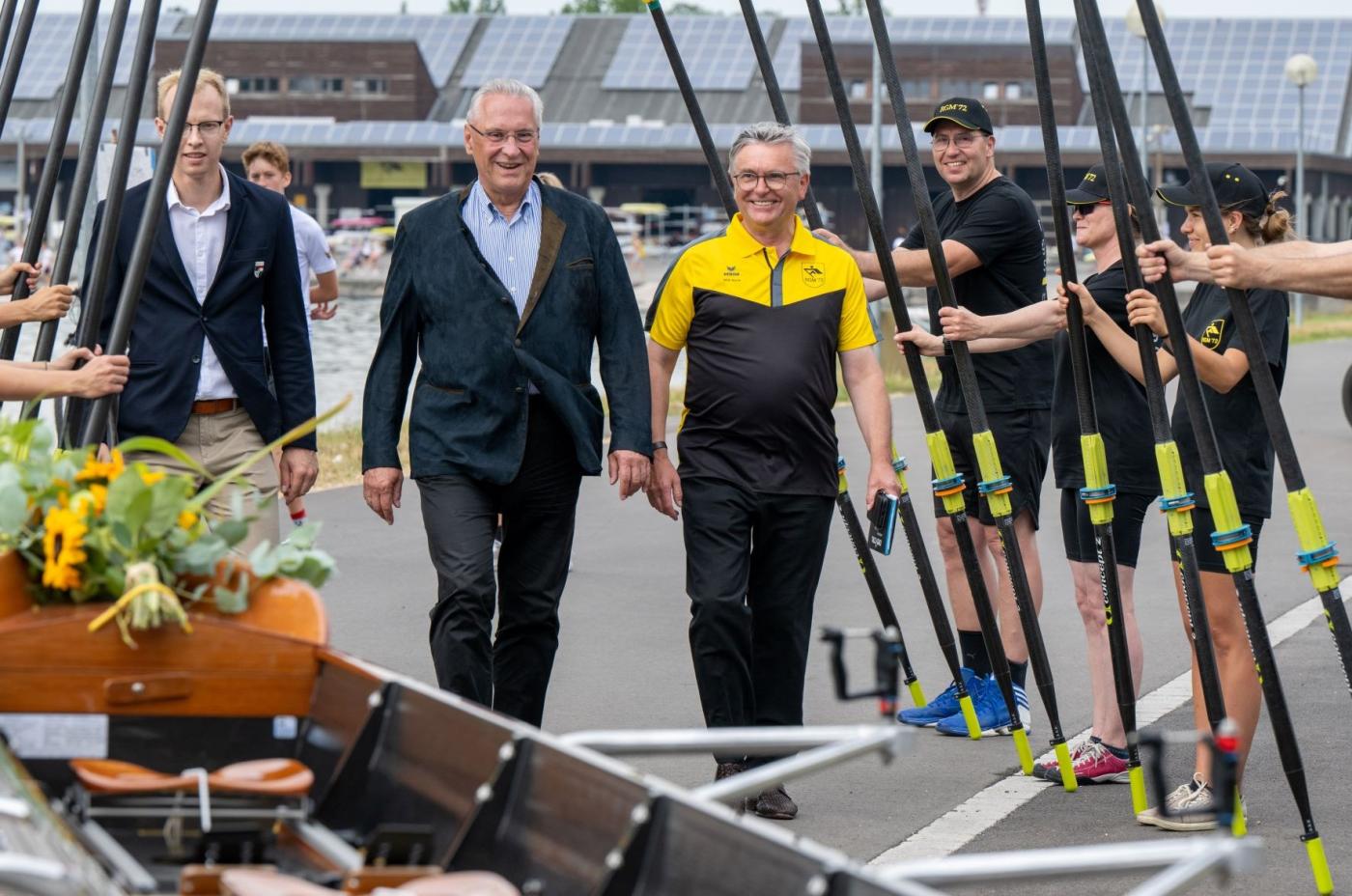 Joachim Herrmann wurde an der Strecke gleich von einem Achter-Spalier der Rudergesell-schaft München begrüßt, durch dass er an zwei neuen Booten vorbeikam, die getauft wur-den. Herrmann taufte einen neuen Renn-Vierer des BRV auf den Namen "München". Da-nach taufte Thomas Schröpfer, RGM-Vorstand für Erwachsenenrudern, einen Gig-Achter.