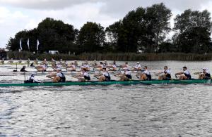 Dies zeigte sich schon auf den ersten zwei Kilometern. Während sich die Niederlande und die USA auf den Mittelbahnen in Führung schoben, lieferten sich das deutsche und das ukrainische Boot auf den Außenbahnen ein kleines Fernduell. Auf dem dritten Kilometer löste sich vorne das US-Boot, und auch die Ukrainer, die von Larina Hillemann aus dem deutschen Frauenachter gesteuert wurden, schoben sich vor auf den dritten Platz. In der Welle der vorgefahrenden TV-Motorboote verlor der Deutschland-Achter schließlich den Kontakt zu den anderen Booten.