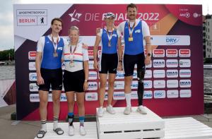 Dominik Siemenroth und Miriam Federle (beide RTHC Bayer Leverkusen) sicherten sich den Titel im PR3Mix2x, Silber ging an Marc Lembeck und Julianne Benndorf (RTHC Bayer Leverkusen/Hallesche RV Böllberg). „Wir kannten unsere Konkurrenten ja schon aus dem Testrennen heute Morgen. Das Wasser ist etwas unbeständig hier durch den Schiffsverkehr, aber wir sind damit gut zurechtgekommen und konnten uns dann am Ende auch durchsetzen“, freut sich Siemenroth.
