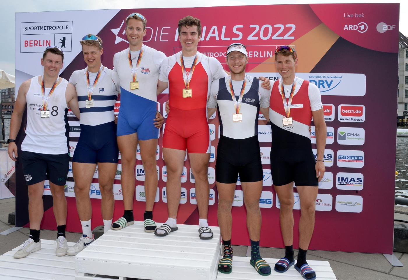 Als erste Deutscher Meister über die Parallel-Sprintdistanz dürfen sich Torben Johannesen und Wolf-Niclas Schröder (RC Favorite Hammonia/RU Arkona Berlin) im Männer-Zweier ohne feiern lassen. Mit einer halben Länge Vorsprung setzten sie sich im großen Finale gegen Laurits Follert und Julian Garth (beide Crefelder RC) durch. Bronze ging an Matthes Schönherr und Olaf Roggensack (RC Potsdam/RC Tegel), die im kleinen Finale gegen Henry Hopmann und Leon Schandl (RC Hansa v. 1898 e.V. Dortmund/Bessel RC) gewannen. „Es hat echt Spaß gemacht, das ist eine wirklich coole Veranstaltung. Ist mal was anderes als über die 2.000. Auf jeden Fall auch wackliger“, so Torben Johannesen nach dem Sieg.