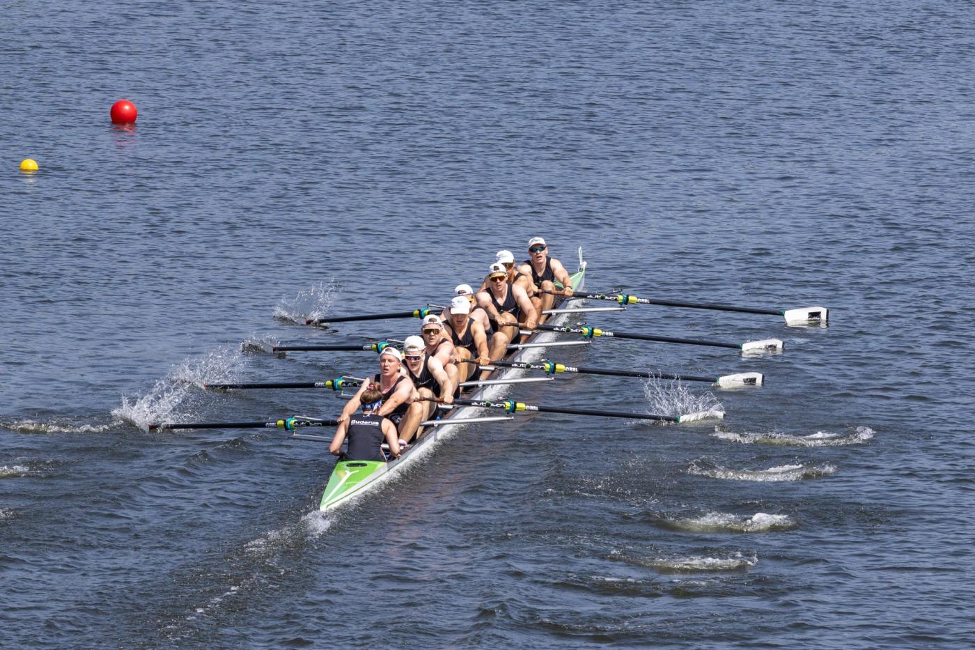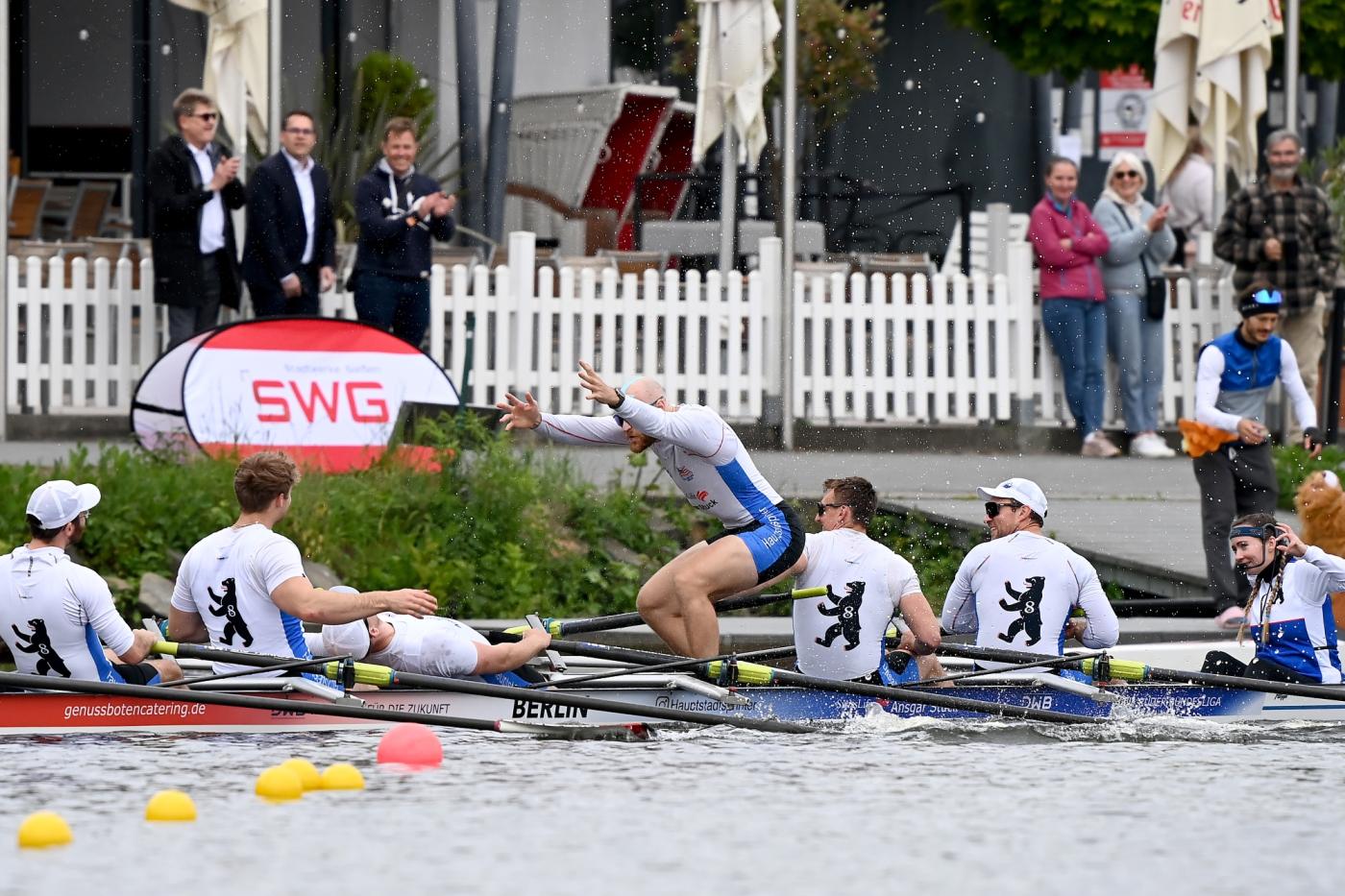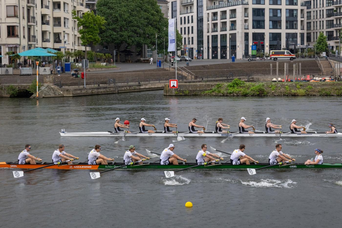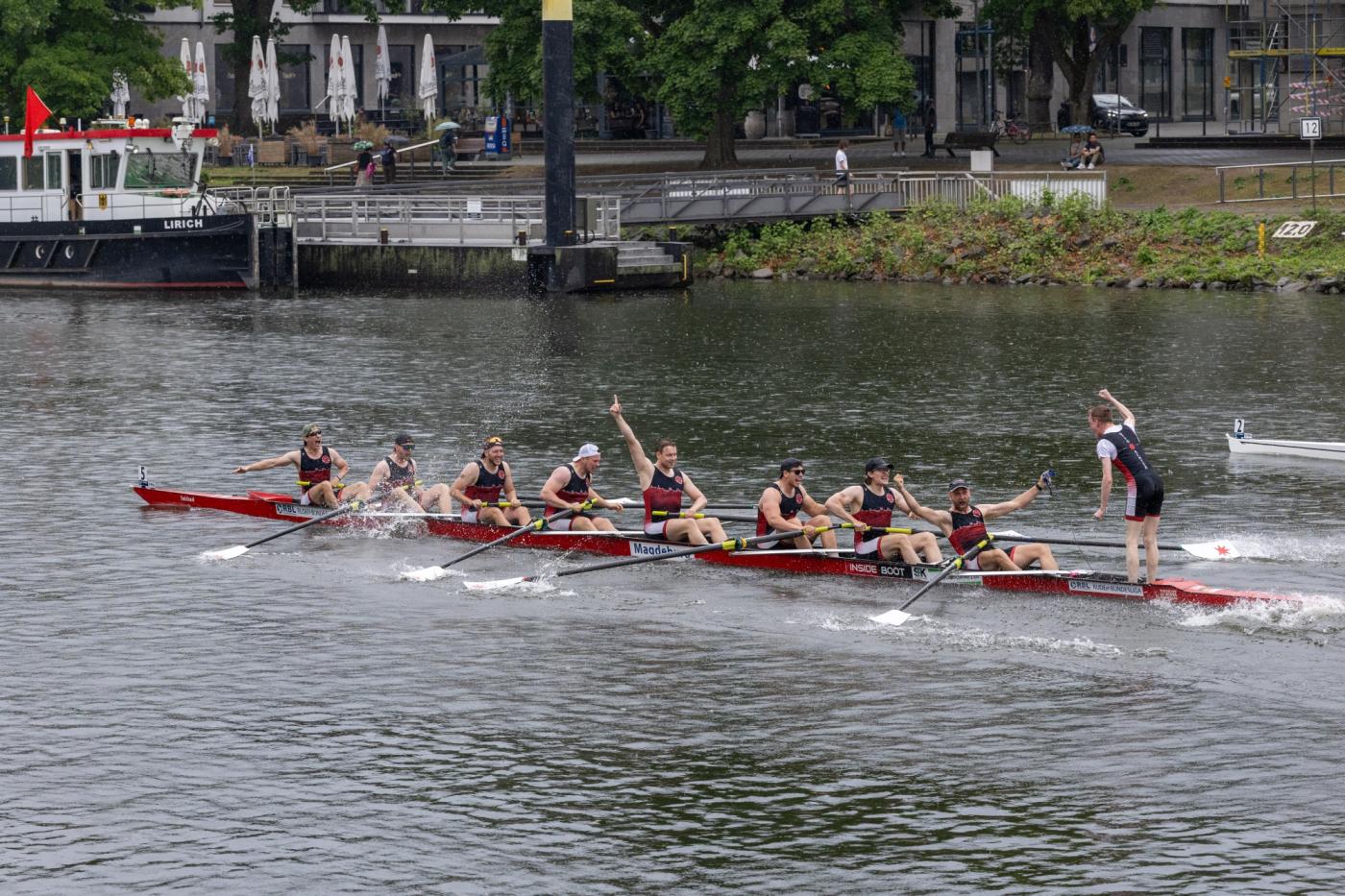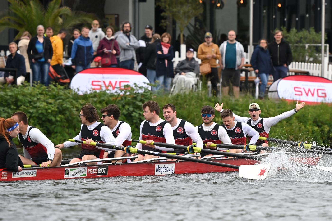 Anders als die Frauenteams konnten die Männerachter ihre Zeiten aus den ersten Läufen fast kontinuierlich verbessern und das trotz immer wieder auffrischenden Windes und kabbeligem Wasser. Angefeuert von ihren Steuerleuten lieferten sich im Viertelfinale der „Häuser unserer Zukunft“ – Ottoachter Magdeburg und der Amazone-Achter Osnabrück das bis dahin knappste Rennen. Sieben Hundertstel trennten die beiden Bugbälle und es dauerte einige Zeit, bis das Zielgericht das Osnabrücker Team als Sieger festgelegt hatte. Der Dr. Schumacher Achter aus Kassel zeigte seine Klasse im Viertelfinale und machte es den BOB Automobile Ruhrpiraten Essen schwer. Im Ziel hatten die Essener den Bug nur knapp vorne. Lange hatte auch der Leipzigachter im Halbfinale mit dem Germania-Achter mitgehalten. Bei der Zielhupe trennten beide Boote nur der Hauch von 7/10 Sekunden.