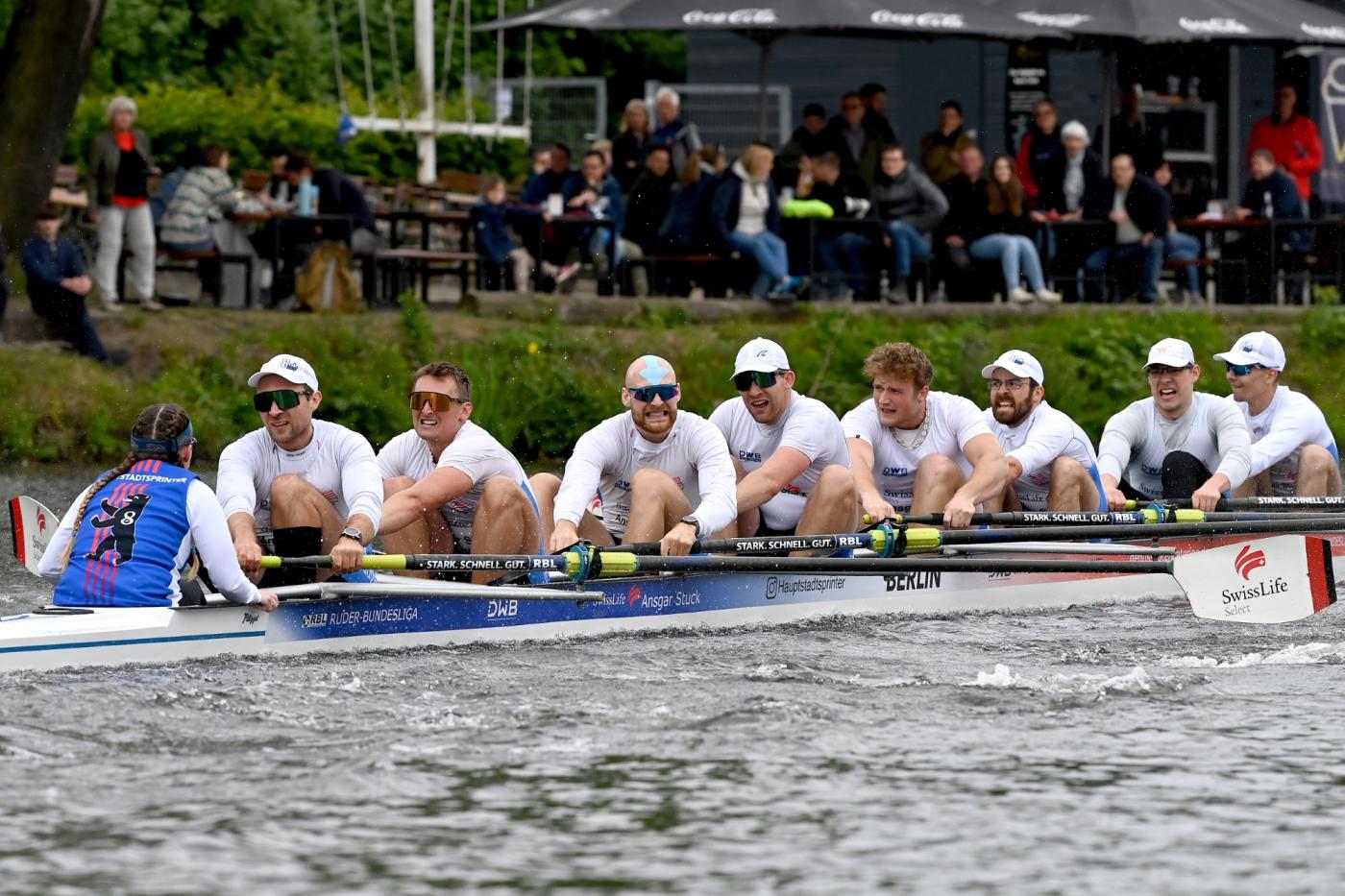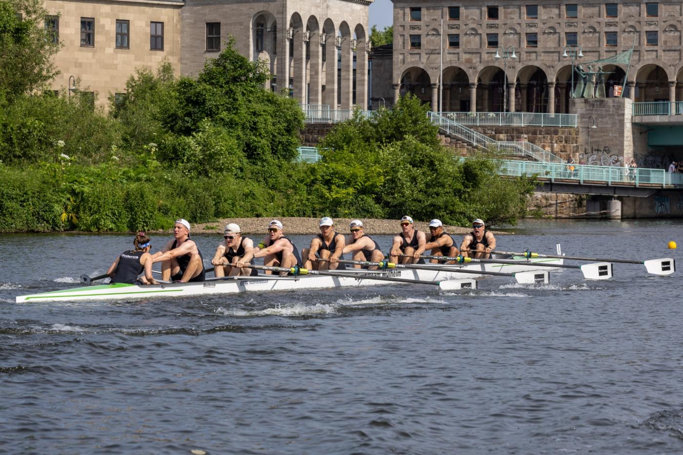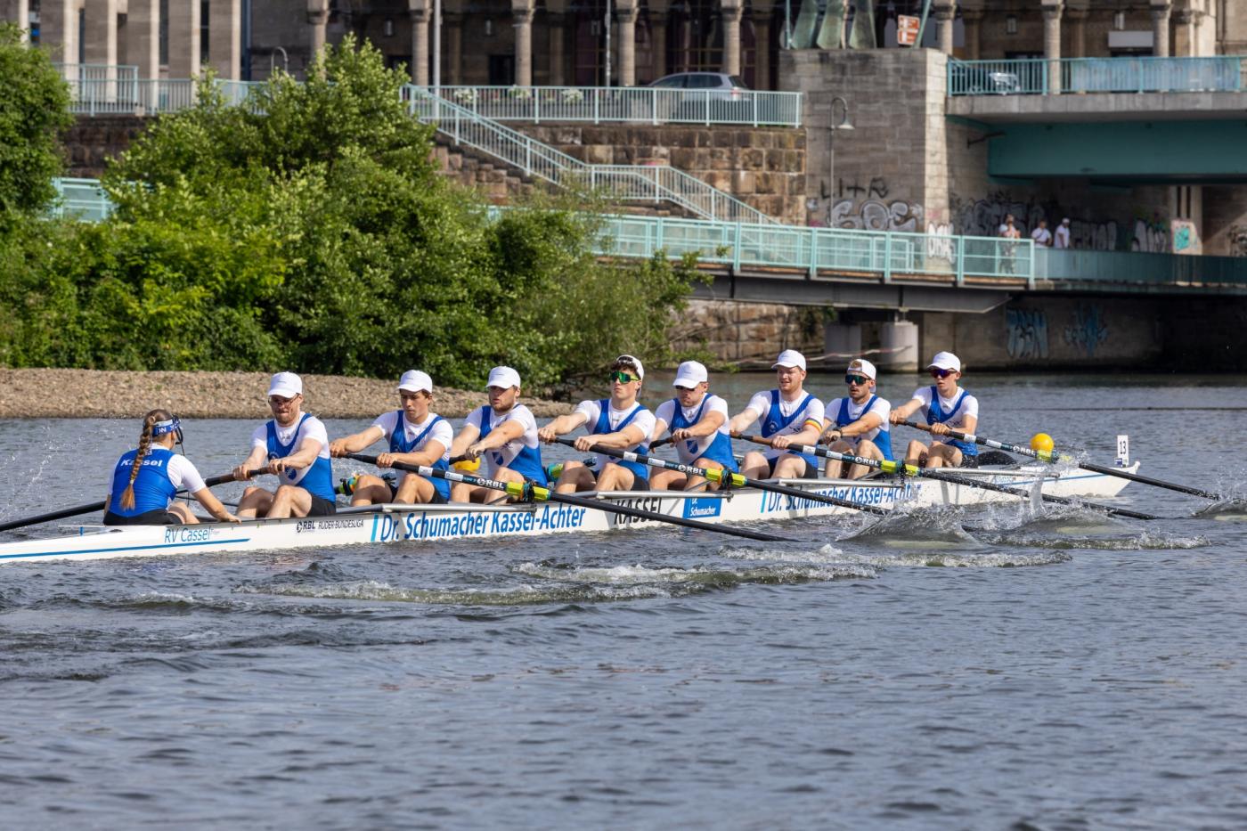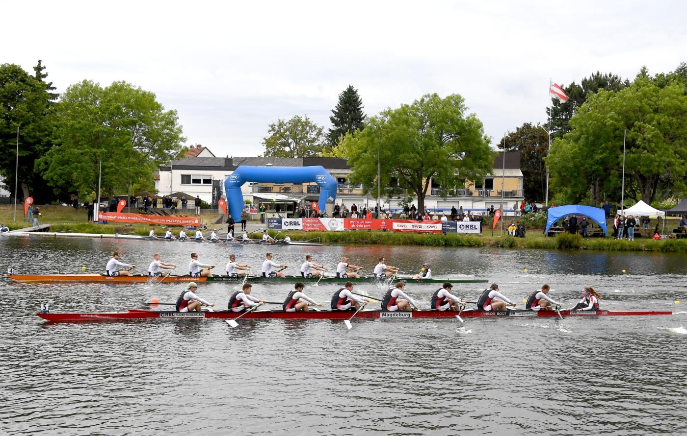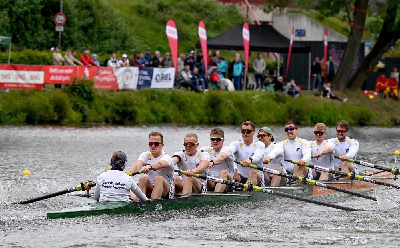Anders als die Frauenteams konnten die Männerachter ihre Zeiten aus den ersten Läufen fast kontinuierlich verbessern und das trotz immer wieder auffrischenden Windes und kabbeligem Wasser. Angefeuert von ihren Steuerleuten lieferten sich im Viertelfinale der „Häuser unserer Zukunft“ – Ottoachter Magdeburg und der Amazone-Achter Osnabrück das bis dahin knappste Rennen. Sieben Hundertstel trennten die beiden Bugbälle und es dauerte einige Zeit, bis das Zielgericht das Osnabrücker Team als Sieger festgelegt hatte. Der Dr. Schumacher Achter aus Kassel zeigte seine Klasse im Viertelfinale und machte es den BOB Automobile Ruhrpiraten Essen schwer. Im Ziel hatten die Essener den Bug nur knapp vorne. Lange hatte auch der Leipzigachter im Halbfinale mit dem Germania-Achter mitgehalten. Bei der Zielhupe trennten beide Boote nur der Hauch von 7/10 Sekunden.