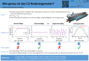 Das C2 stellt de facto den Standard für Training, Wettkampf und Diagnostik dar. Erstaunlicherweise wurde die Genauigkeit des Ergometers und seines PM5-Monitors bislang nicht für die Bedingungen des Hochleistungssports untersucht. Die erstmalige Messplatz-gebundene Evaluation des C2-Ergometers zeigte eine durchaus zufriedenstellende Genauigkeit bei gleichmäßigem Rudern, die für das Training hinreichend exakt ist. Es zeigte sich zudem kein relevanter Einfluss der Schlagstruktur (Vorder-, Mittel- oder Endzugbetonung) auf die Genauigkeit. Variationen der Zugkraft und Unregelmäßigkeiten im Verhältnis von Zug- zu Vorrollphase zeigten dagegen einen relevanten Einfluss auf die Genauigkeit des C2. Dieses Problem gipfelt in den Startschlägen, deren Leistung das C2 extrem unterschätzt. Die Genauigkeit des C2 ist also für Trainingszwecke ausreichend, hängt aber von der Gleichmäßigkeit des Ruderns und der Anzahl der erfassten Schläge ab. Für kurze Tests und wissenschaftlich exakte Leistungsdaten ist das C2 ohne zusätzliches Messsystem (z.B. FES Ruderergo-Dyno) nicht geeignet.