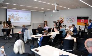 Der modernisierte und ausgebaute Bundesstützpunkt Ruderakademie hat nun auch ein eigenes Logo, ebenfalls von der Designerin Zuzana Bahulova entworfen, das Bundesstützpunktleiter Reinhart Grahn vorstellte. Es greift mit zwei Mal fünf Rechtecken die ursprüngliche Fensteransicht der Akademie auf. Tabea Schendekehl aus dem Frauen-Doppelvierer formulierte den Dank der Athleten an die Ruderakademie und deren Angestellte für die sehr guten Trainingsbedingungen. Helma Burazerovic, Ratzeburgs 2. Stellvertretende Stadtpräsidentin, richtete ein Grußwort an die Nationalmannschaft, in dem die jahrzehntelange enge Verbundenheit zwischen Stadt und Rudern zum Ausdruck kam, die sich auch in der Beteiligung an den noch nicht abgeschlossenen Baumaßnahmen niederschlug. „Sie können sicher sein, dass wir in Ratzeburg mitfiebern werden, wenn Sie um Medaillen kämpfen“, sagte Burazerovic.