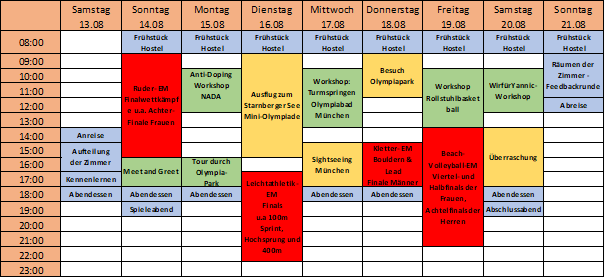 Natürlich ist ein Besuch der Finalentscheidungen der Ruder-Europameisterschaften dabei fest eingeplant. Geplant sind außerdem Besuche bei den Beach-Volleyballern, bei den Kletterern und ein Ausflug ins Olympiastadion, wo wir gemeinsam die Leichtathleten bestaunen können. Aber auch abseits des aktiven Sports bieten wir ein buntes und spannendes Rahmenprogramm mit verschiedensten Workshops und sportlichen Aktionen.