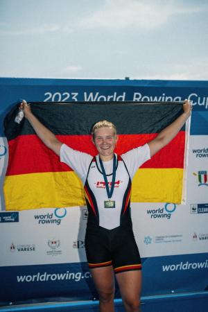 Direkt im Anschluss ruderte Alexandra Föster (RC Meschede) ein herausragendes Rennen im Finale des Frauen-Einers. Sie ging zunächst mit der Australierin Tara Rigney in Führung, bis Kara Kohler (USA) nach der Streckenhälfte aufschloss. Die Ruderin aus dem Sauerland startete dann 500m vor dem Ziel einen starken Endspurt, dem die Australierin nicht gegenhalten konnte. Am Ende war sie vielmehr froh, Gold vor Kohler zu retten. Für Alexandra Föster ist es die Rückkehr an die Weltspitze, nachdem der Start in die Saison aufgrund von Erkrankungen schwierig war. So war Trainer Sebastian Kleinsorge auch sehr zufrieden: „Das war ein extrem cooles Rennen. Alexandra hat geschaut was passiert und wollte nicht mit aller Gewalt führen. Es war klar, dass es am Ende spannend werden würde. Ich freue mich, dass das Training nach der dreimonatigen Zwangspause so gut angesprochen hat und Alexandra sich in der Weltspitze mit dem 1. Platz zurückmelden konnte.“ Alexandra Föster glücklich im Interview: „Ich bin super erleichtert, dass ich vorne wieder dabei war. Als ich das Meldefeld gesehen hatte, hatte ich schon Angst, überhaupt das Finale zu schaffen. Deswegen war es von Rennen zu Rennen eine Erleichterung, dass ich vorne mitfahren konnte. Jetzt zu gewinnen war super, besser geht es nicht.“