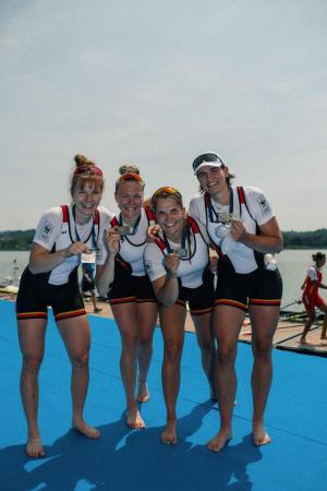 Die erste Medaille für den DRV holte der Frauen-Doppelvierer, eine Bootsgattung in der der DRV eine große Tradition hat. Sarah Wibberenz, Pia Greiten, Frauke Hundeling und Tabea Schendekehl (RC Havel Brandenburg/Osnabrücker RV/DRC Hannover/RC Hansa Dortmund) ruderten ein beherztes Rennen und hatten vor allem die Schweiz im Blick. Diese konnten sie in einem beherzten Endspurt niederkämpfen, nachdem die Position drei im Rennen zwischen beiden Booten ständig wechselte. Damit sollte sich dem Team eine gute Perspektive für die WM bieten. An der Spitze ruderten die amtierenden Weltmeisterinnen aus China und Großbritannien um Gold. Die lange deutlich führenden Chinesinnen hatten vor der Ziellinie große Mühen, die Britinnen im Endspurt abzuwehren, behielten aber knapp die Oberhand. Pia Greiten nach dem Rennen: „Die mittleren 1000m sind deutlich besser gelungen als in Bled. Wir hatten in den letzten beiden Tagen Abschnitte, wo es gut gelaufen ist, andere in denen wir noch arbeiten müssen. Den Endspurt sind wir so gefahren, wie es sein muss und so blieben wir vor der Schweiz.“