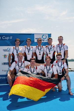 Der mittlerweile von Sabine Tschäge trainierte Achter wollte seine Entwicklung im Training auf die Strecke bringen. Olaf Roggensack, Jasper Angl, Benedict Eggeling, Torben Johannesen, Max John, Mattes Schönherr, Wolf-Niclas Schröder, Marc Kamann und Steuermann Jonas Wiesen (RC Tegel Berlin/RV Münster/beide RC Favorite Hammonia Hamburg/ORC Rostock/RC Potsdam/RU Arkona Berlin/Der Hamburger und Germania RC/RG Treis-Karden) ruderten ein starkes Rennen, dem Großbritannien seinen Stempel aufdrückte und deutlich siegte. Damit war das Land in allen Rennen der Männer-Riemen erfolgreich. Kanada führte bis 1500m die Verfolger an, das Boot des DRV ruderte knapp dahinter. Dann kamen die Australier auf, während die Nordamerikaner zurückfielen. Der DRV-Achter wehrte sich energisch, konnte aber den Australiern nicht folgen und holte mit ca. 0,5 Sekunden Rückstand die Bronzemedaille. Damit hat sich das Team in der Weltspitze eindrucksvoll zurückgemeldet. Mattes Schönherr: “Wir haben uns vorgenommen, die Leistung zu steigern und haben geschaut, was wir in Bled nicht ganz so gut gemacht hatten. Wir sind gut rausgekommen und im Vergleich zum Bahnverteilungsrennen war der Endspurt deutlich besser“.