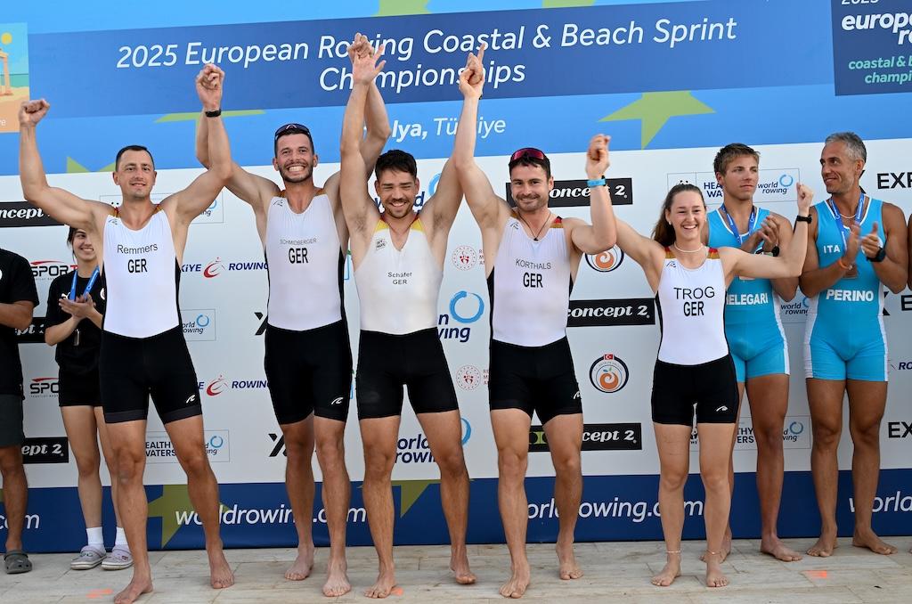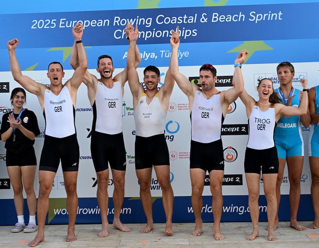 Der deutsche Männer-Vierer hat seinen Europameistertitel eindrucksvoll verteidigt. Bei den European Rowing Coastal Championships 2025 in Antalya siegte das Team um Maiko-Benedikt Remmers, Emil Schmidberger, Lucas Schäfer und Moritz Korthals (Regattaverband Ems-Jade-Weser / Stuttgarter RG / Marburger Ruderverein / Stuttgarter RG), gesteuert von Elisa Trog (Erster Kieler RC), in 23:36,74 Minuten.