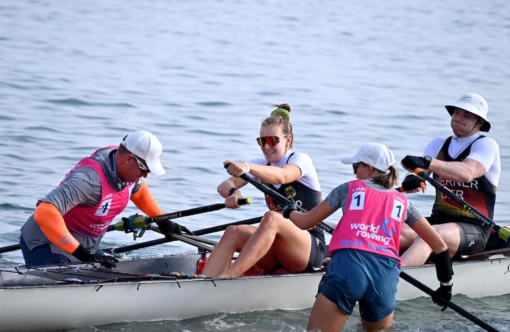 Der Mixed-Vierer mit Steuerfrau (CMix4x+) um Moritz Korthals (Stuttgarter RG), Laura Brenker, Anne Kistenpfennig (beide Mainzer RV), Leander Spalek (Frankfurter RG Germania) und Steuerfrau Jette Hansen (Der Hamburger und Germania RC) belegte Rang sieben. Besonders bemerkenswert: Hansen startete trotz einer schmerzhaften Kapselverletzung am Fuß und führte das Boot sicher über den Kurs. Der Vierer verpasste damit zwar den direkten Sprung ins Viertelfinale, geht aber mit Zuversicht in die Repechages.