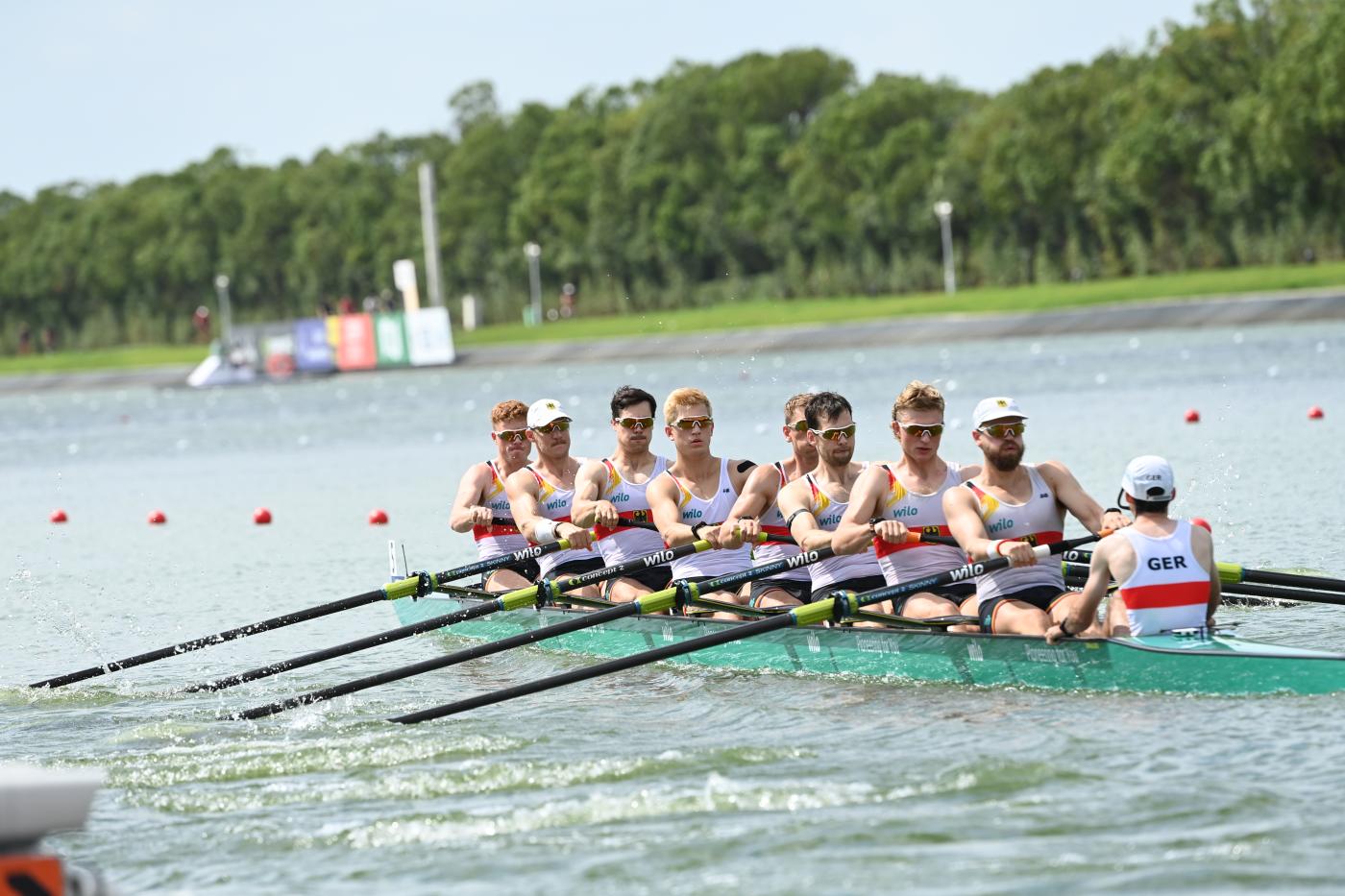 Achter, Vorlauf: 1. Niederlande 5:42,29 Minuten, 2. USA 5:46,36, 3. Deutschland (Theis Hagemeister, Sönke Kruse, Julius Christ, Olaf Roggensack, Tobias Strangemann, Benedikt Eggeling, Mattes Schönherr, Paul Klapperich, Steuermann Jonas Wiesen) 5:49,18, 4. Kanada 5:55,98, 5. China 6:14,03.